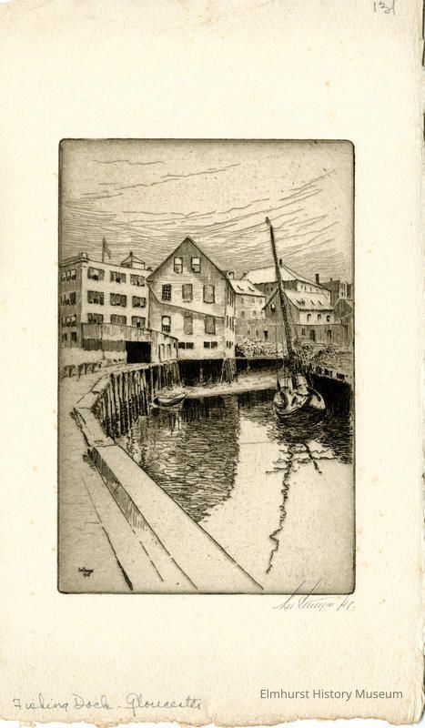 Etching showing the waterfront of a town built by a bay, sailing boat in midground. Signed and dated.