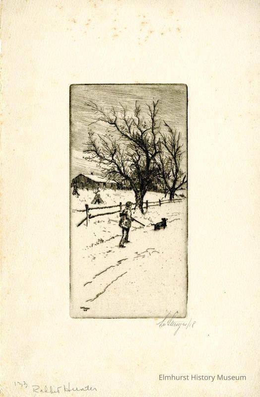 Etching of a man (with gun) and dog against a background of a fenced field, trees, cornstocks and buildings. Signed and dated.