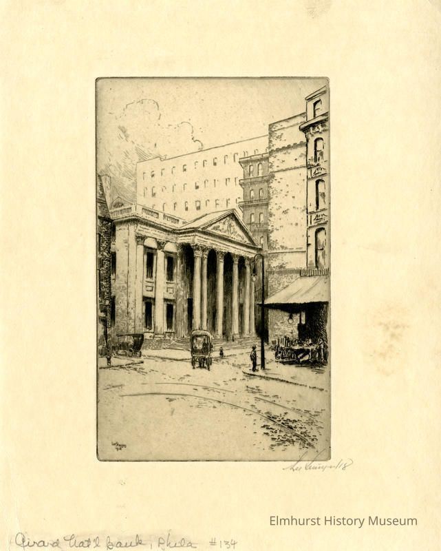 Etching of a bank building on a street corner with larger buildings in the background. Auto, horse, wagon, man in foreground. Signed and dated.