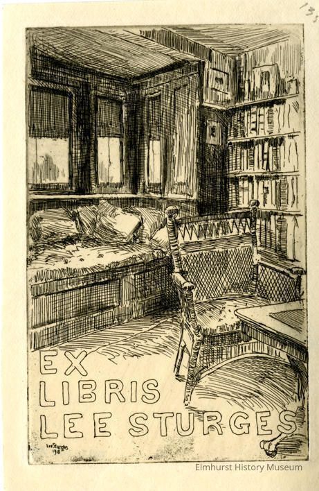 Book Plate: Etching of a tabel, chair and cushioned alcove. Also books on shelves along the wall on the right side. Signed and dated.