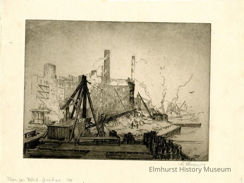 Etching of cranes used in construction against a background of large buildings. Signed and dated.