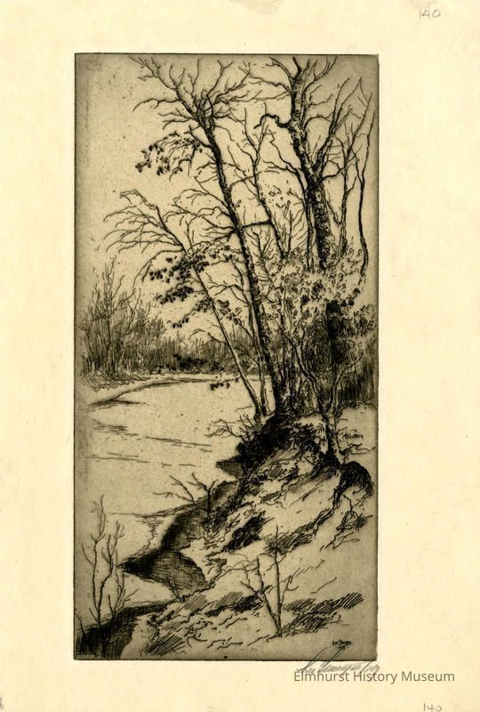 Etching of a river; ice melting near the river bank. Signed and dated.