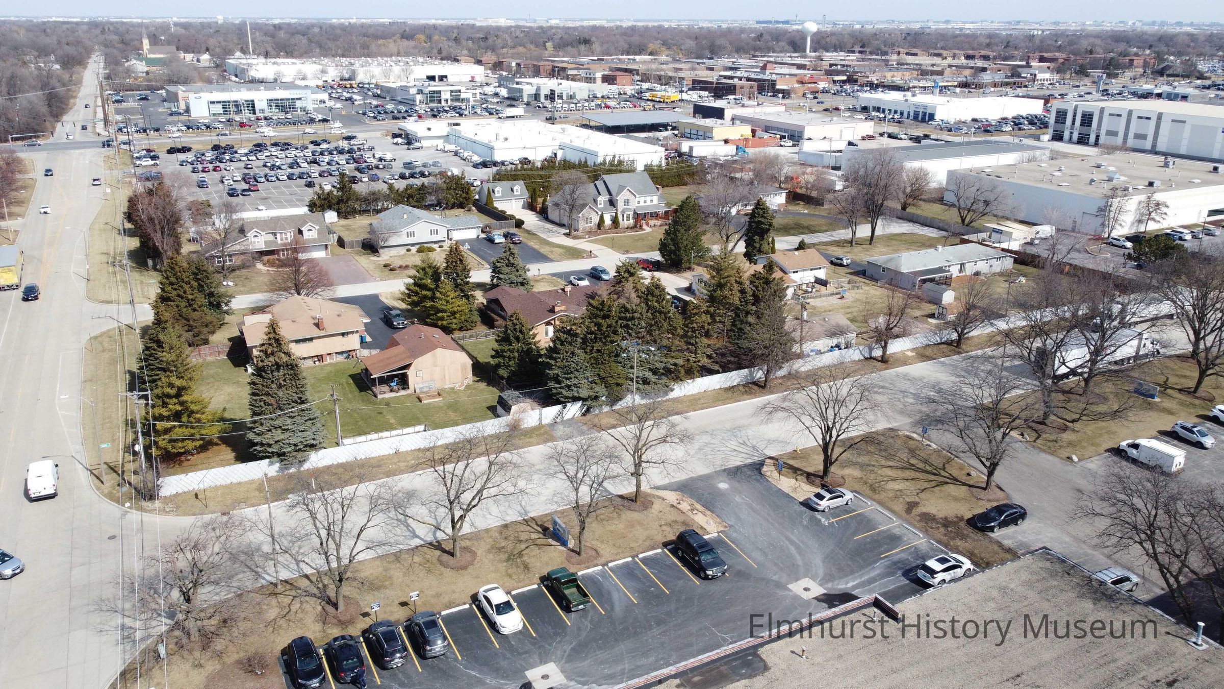 Aerial view of homes on Evergreen Lane in the Elmhurst Industrial Park, looking north towards Grand Avenue from Carol Lane.Photograph Details