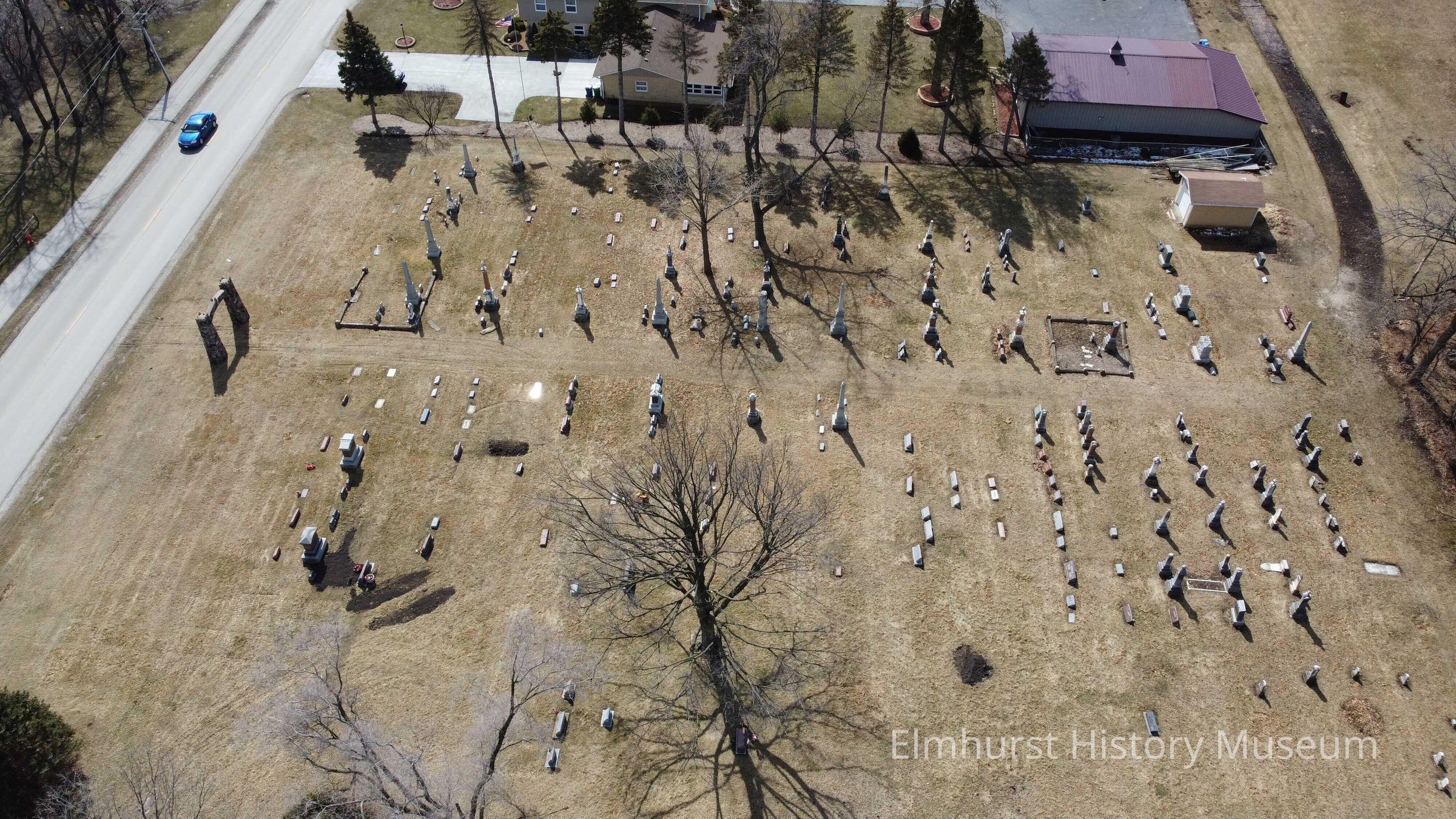 Aerial view of the Churchville Cemetery on the west side of Church Road, north of Grand Avenue, looking south. The Churchville one room school is to the north of the cemetery.