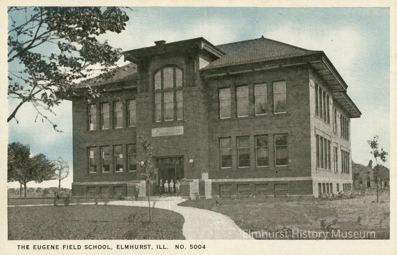 Written on back: Mrs. W. Hild 325 Highview Av. Elmhurst, IL / Elmhurst - Schools / Eugene Field School built in 1912 at 3rd & York - Building later sold to Insurance Co. & a new Eugene Field School was built at Berteau & North Av. Publishing credit: Wm. G. Hoffman, Pub / 4439 Washington Blvd. Chicago