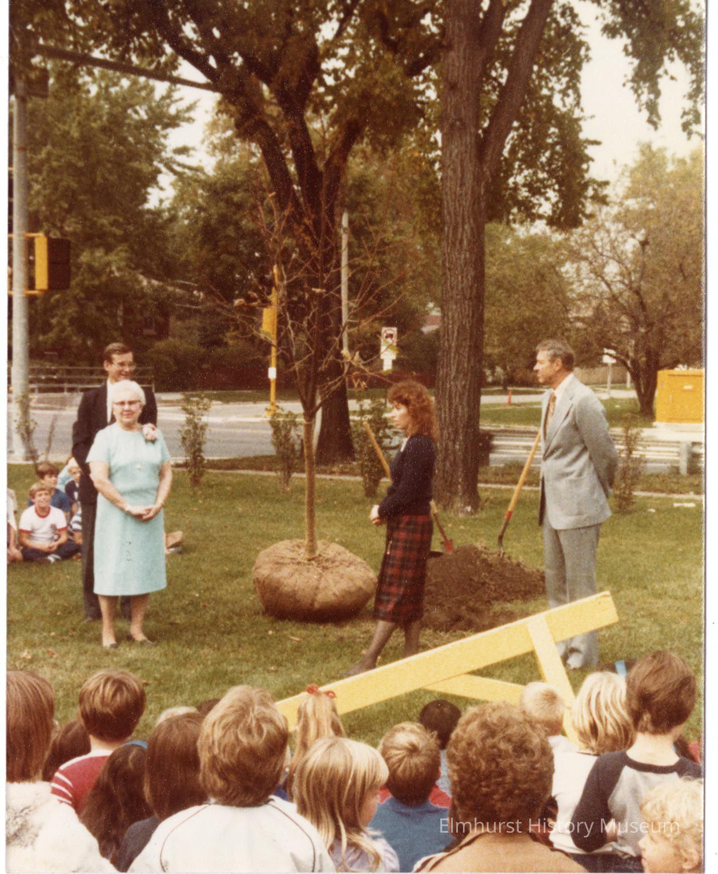 A tree is planted in front of Field School during a ceremony honoring former teacher Audra Pence, who taught at Field School for 43 years before retiring in 1984 and passing away in March 1986.Photograph Details