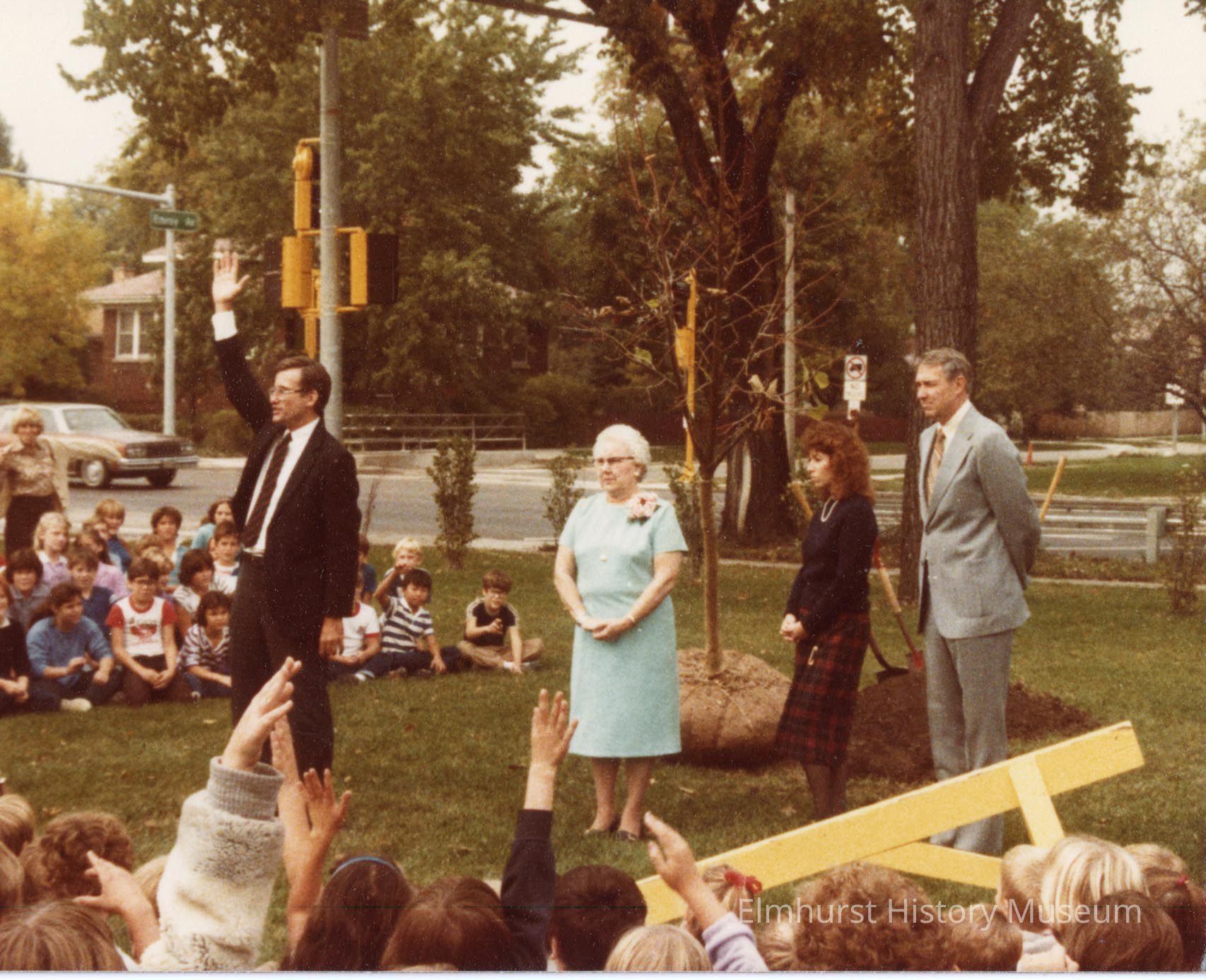 A tree is planted in front of Field School during a ceremony honoring former teacher Audra Pence, who taught at Field School for 43 years before retiring in 1984 and passing away in March 1986.Photograph Details