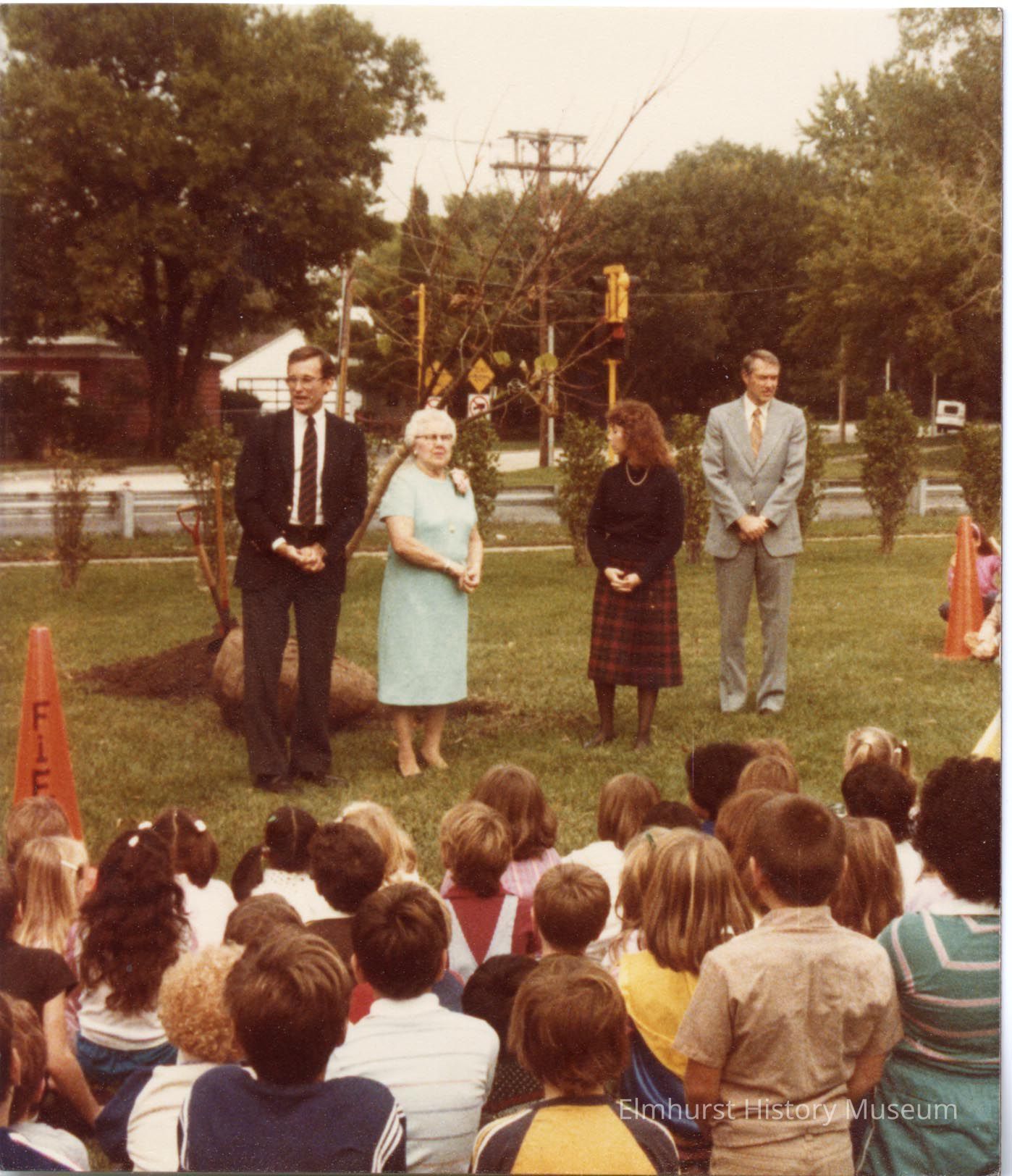 A tree is planted in front of Field School during a ceremony honoring former teacher Audra Pence, who taught at Field School for 43 years before retiring in 1984 and passing away in March 1986.Photograph Details
