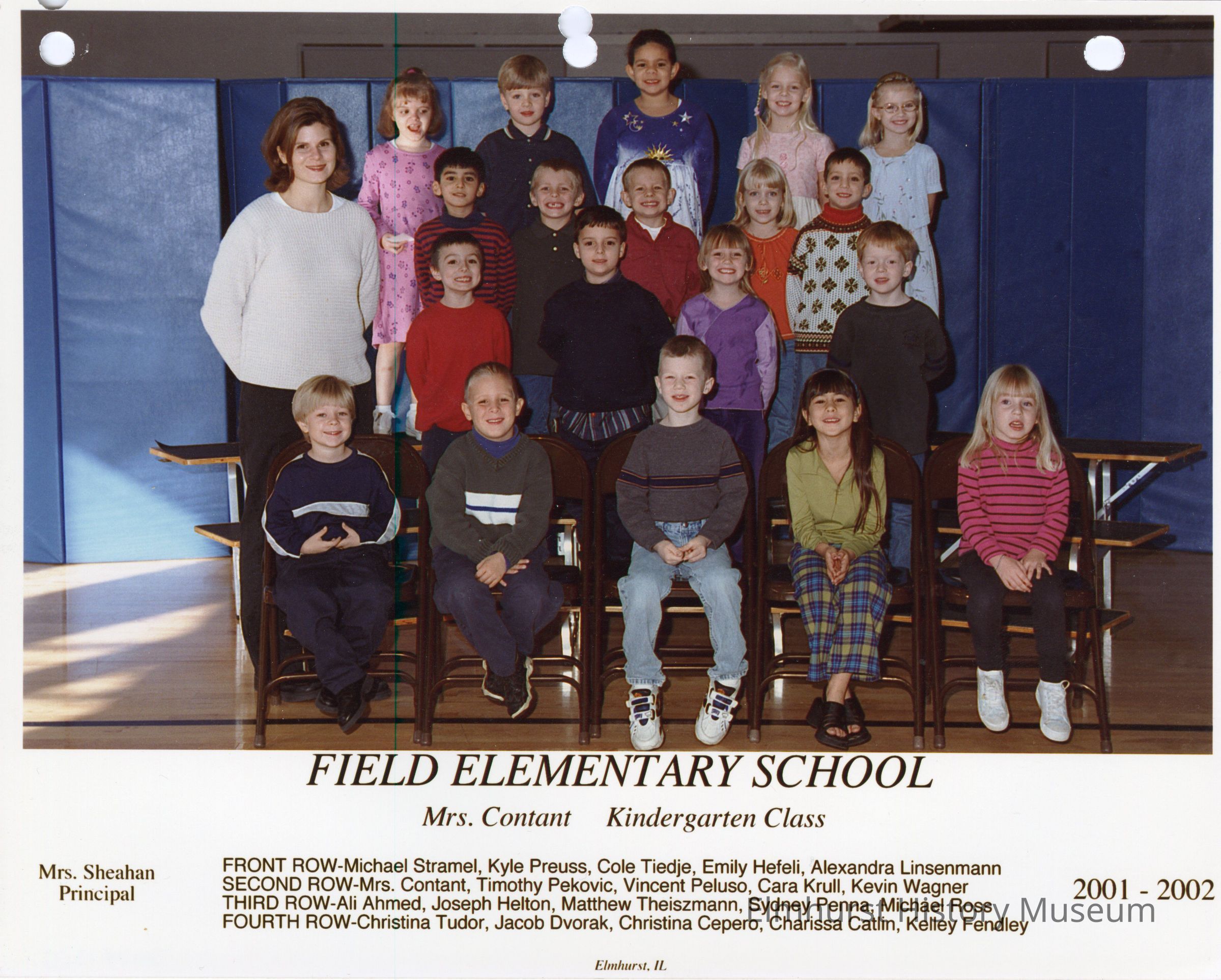 Kindergarten class photograph from Field Elementary School, under teacher Mrs. Contant. Student names are listed at the bottom of the photograph.Photograph Details