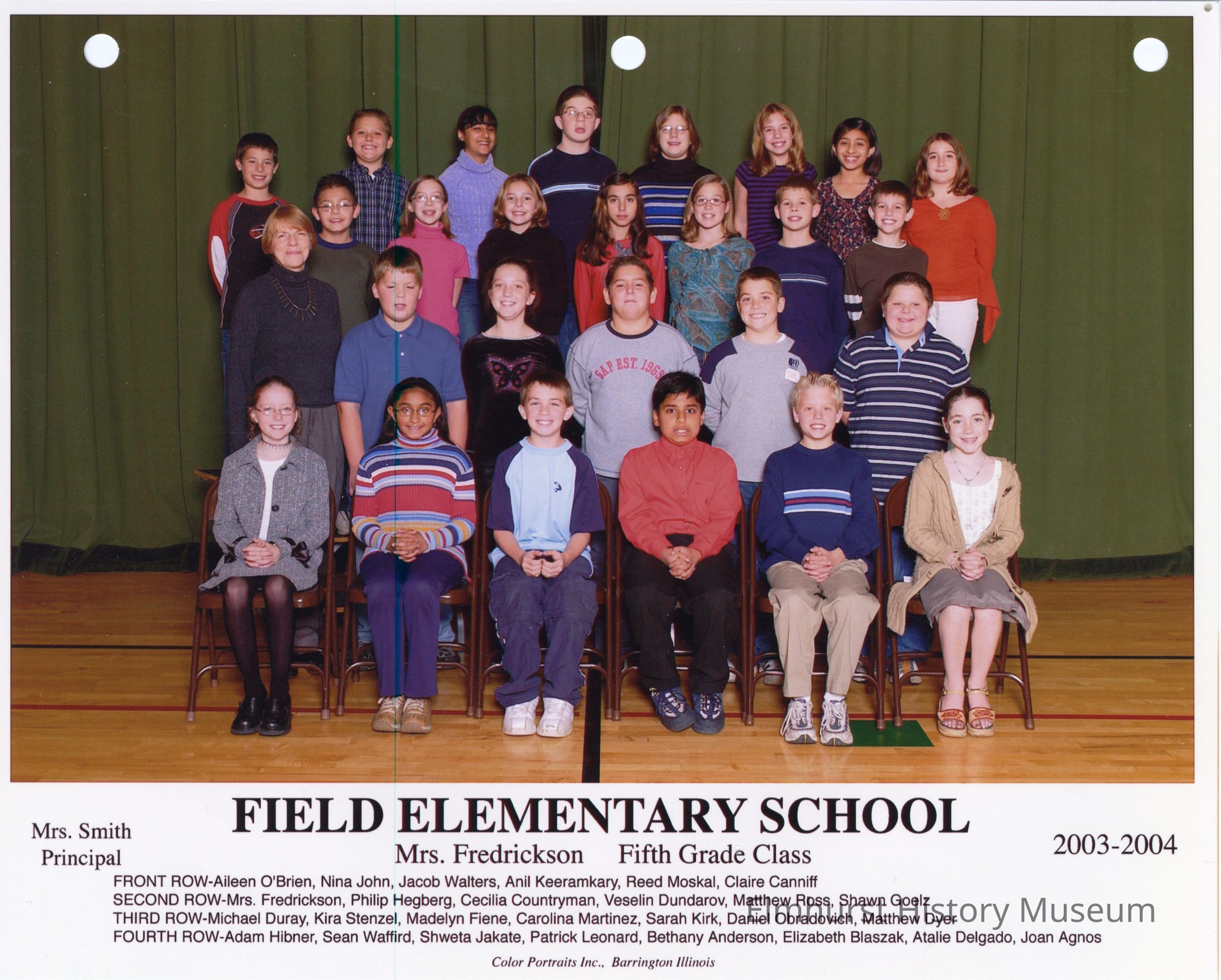Fifth grade class photograph from Field Elementary School, under teacher Mrs. Frederickson. Student names are listed at the bottom of the photograph.Photograph Details