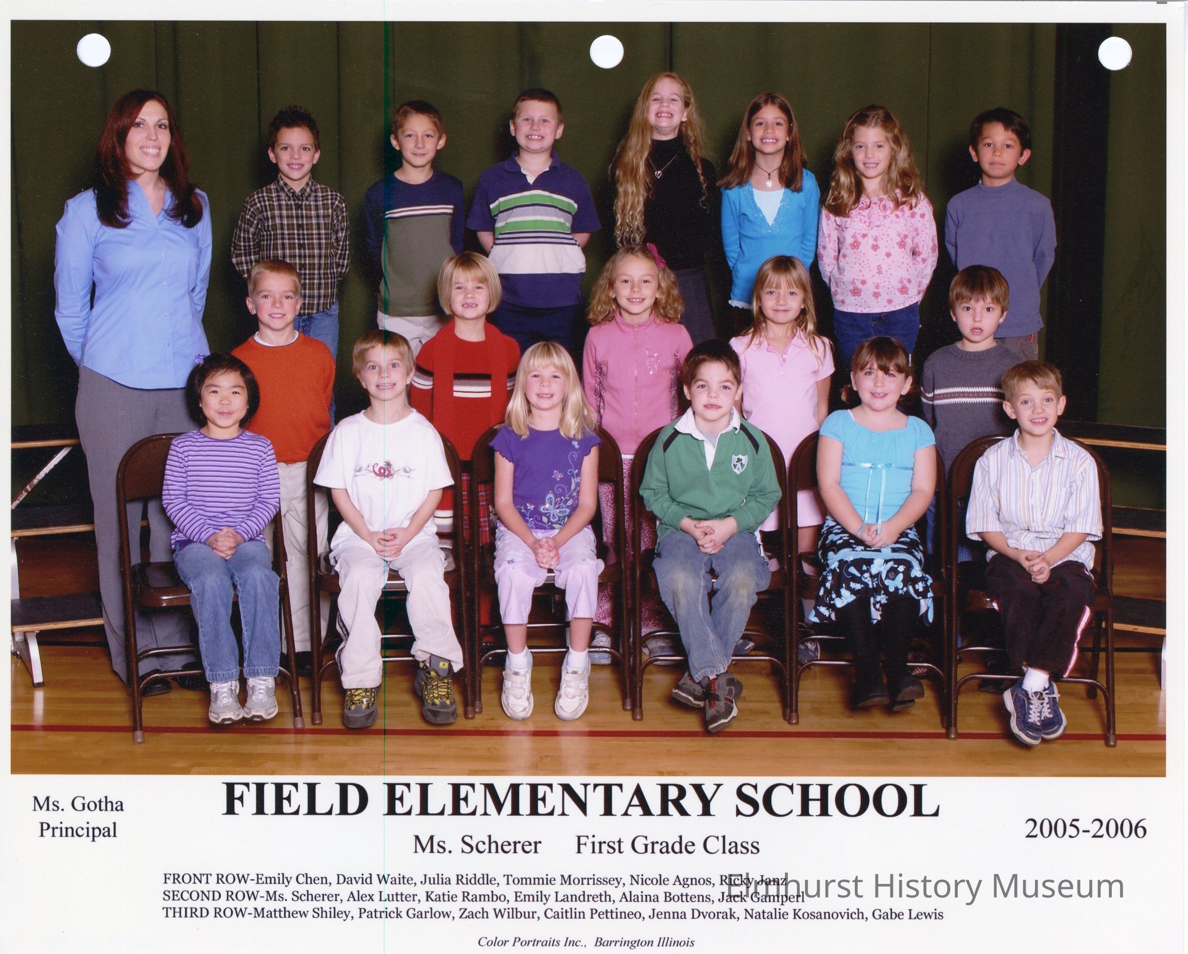 First grade class photograph from Field Elementary School, under teacher Ms. Scherer. Student names are listed at the bottom of the photograph.Photograph Details