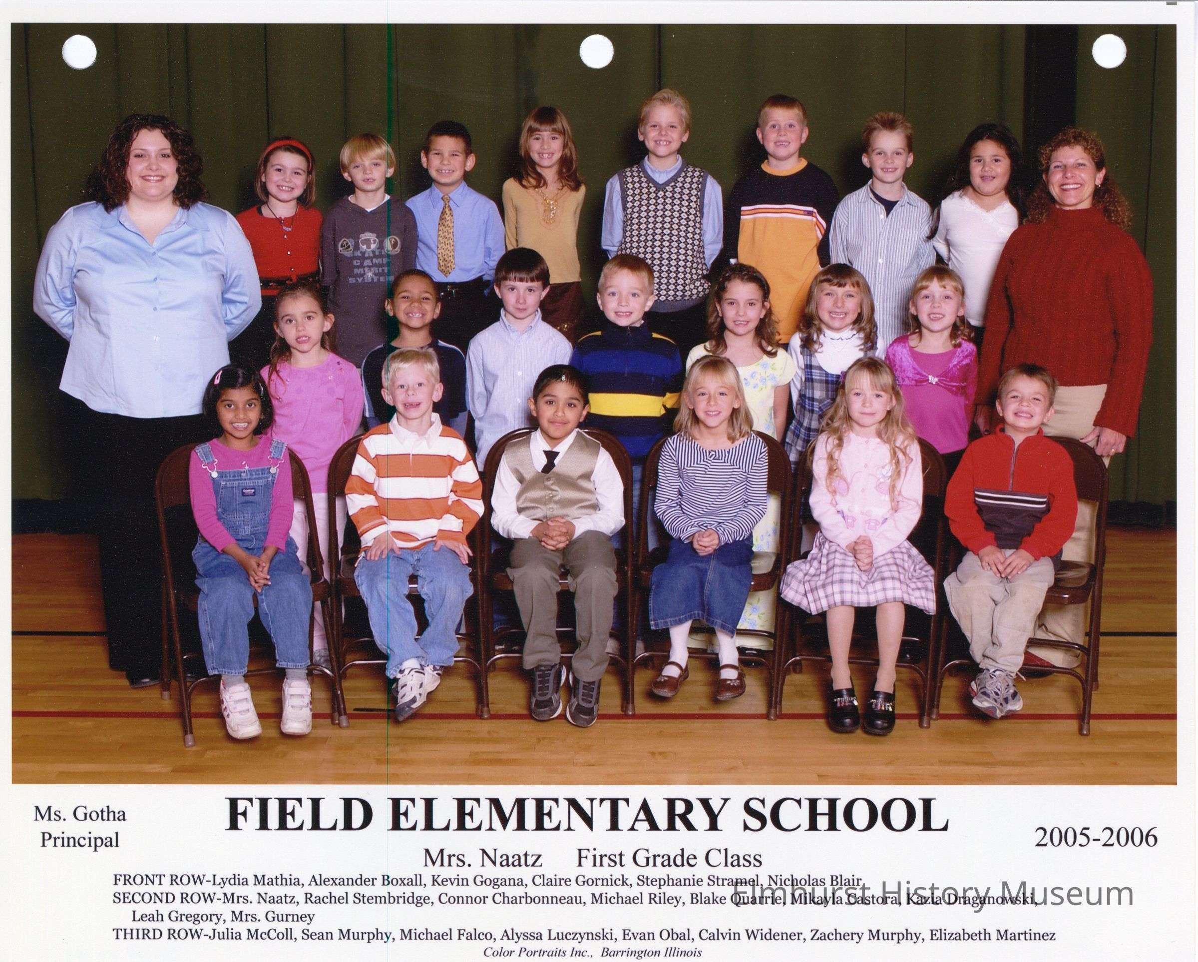 First grade class photograph from Field Elementary School, under teacher Mrs. Naatz. Student names are listed at the bottom of the photograph.Photograph Details