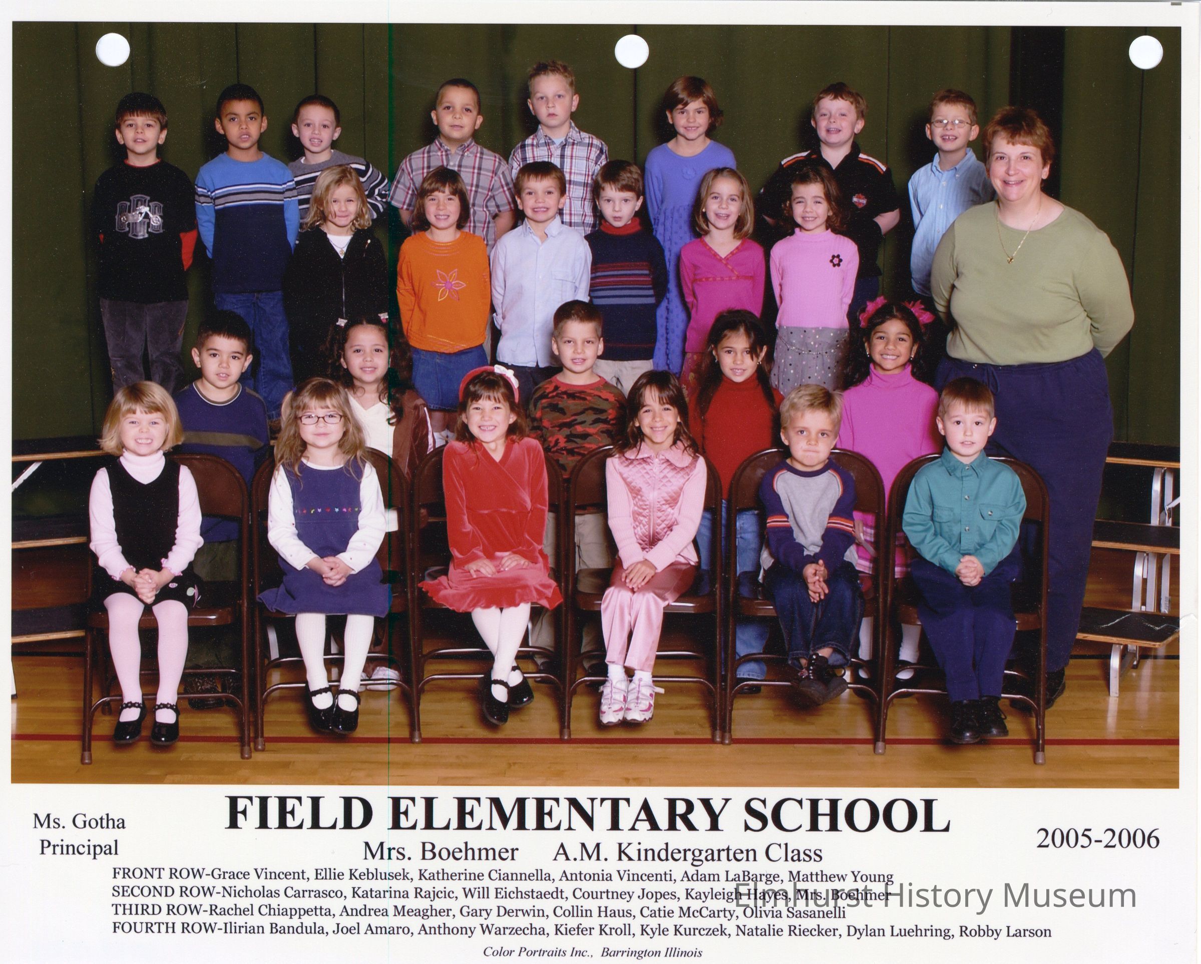 Kindergarten class photograph from Field Elementary School, under teacher Mrs. Boehmer. Student names are listed at the bottom of the photograph.Photograph Details