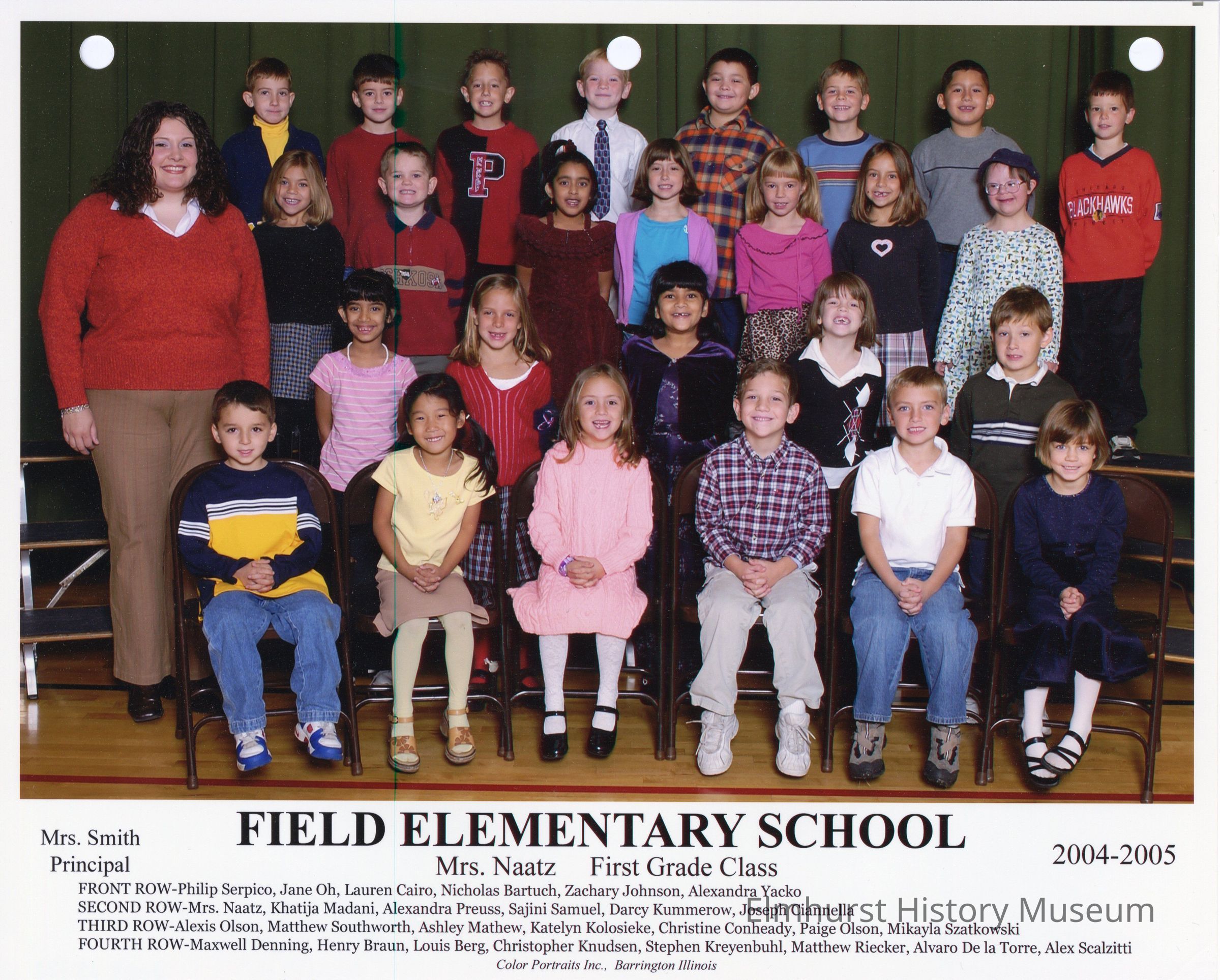 First grade class photograph from Field Elementary School, under teacher Mrs. Naatz. Student names are listed at the bottom of the photograph.Photograph Details