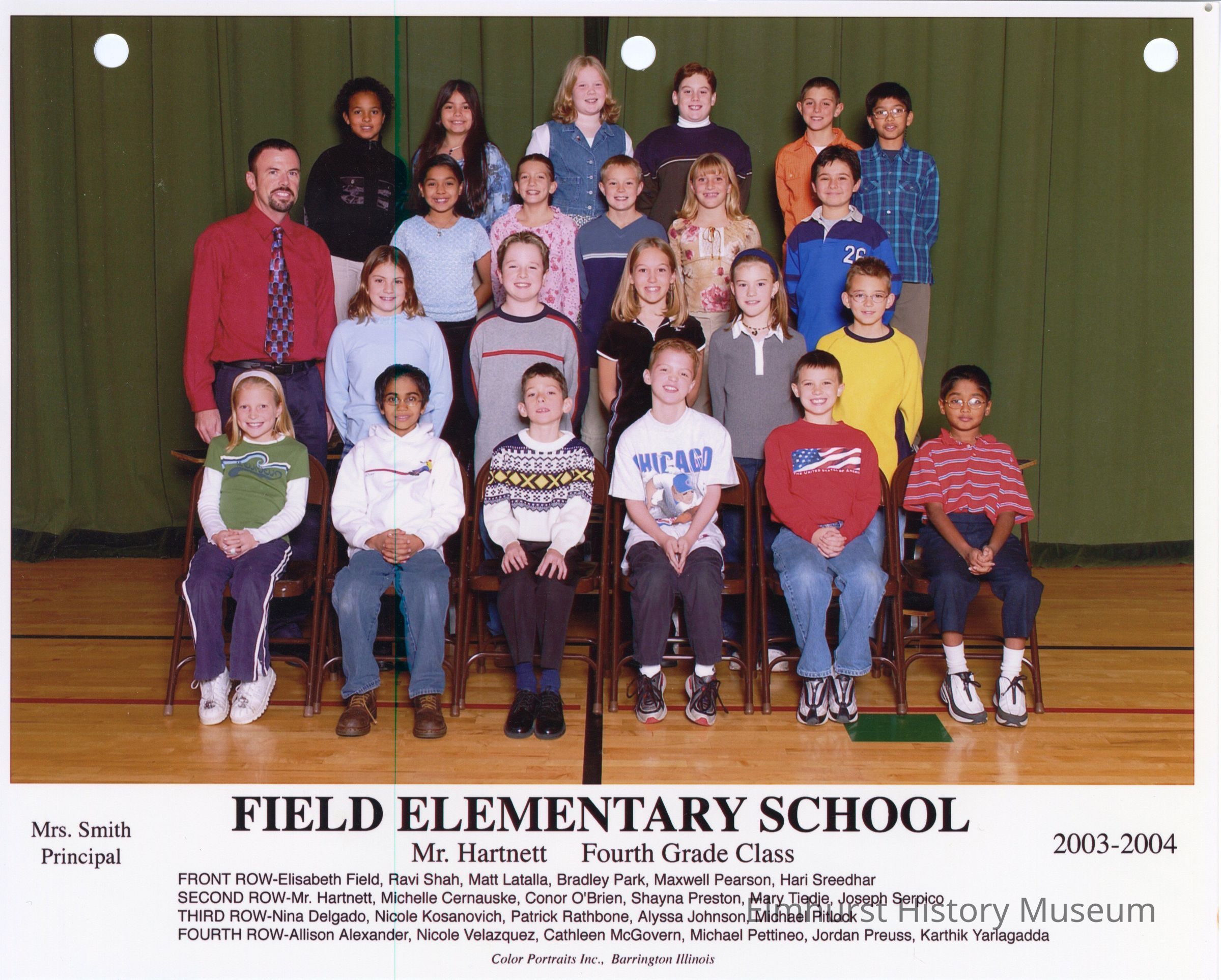 Fourth grade class photograph from Field Elementary School, under teacher Mr. Hartnett. Student names are listed at the bottom of the photograph.Photograph Details