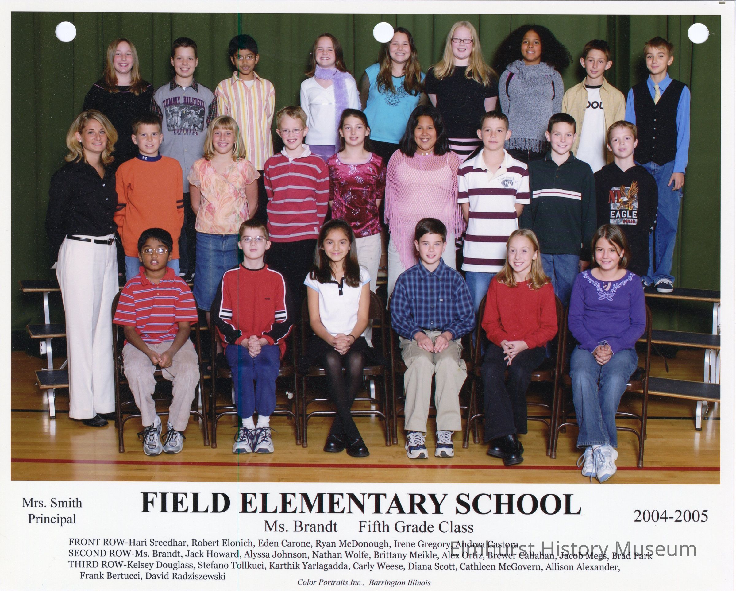 Fifth grade class photograph from Field Elementary School, under teacher Ms. Brandt. Student names are listed at the bottom of the photograph.Photograph Details