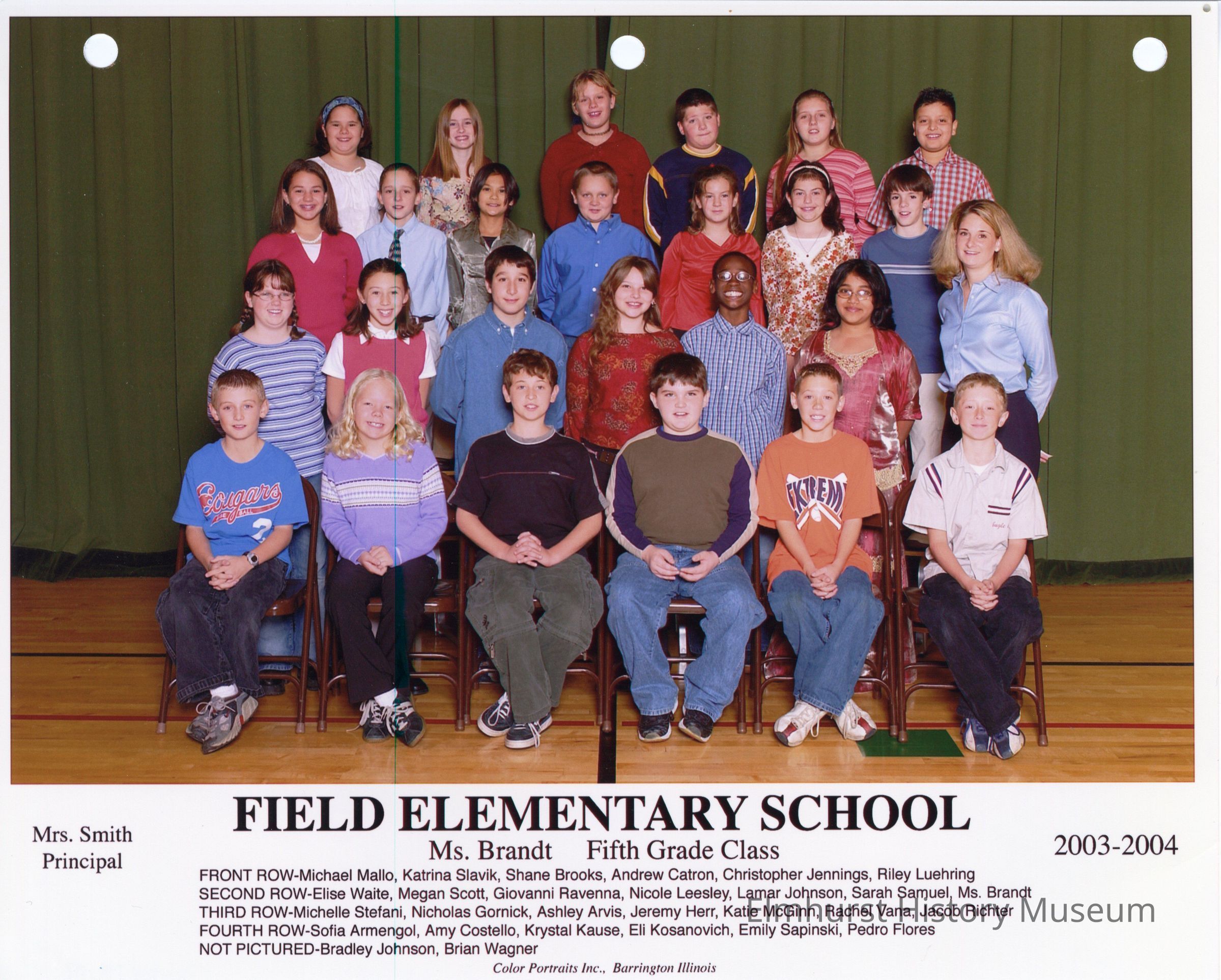 Fifth grade class photograph from Field Elementary School, under teacher Ms. Brandt. Student names are listed at the bottom of the photograph.Photograph Details