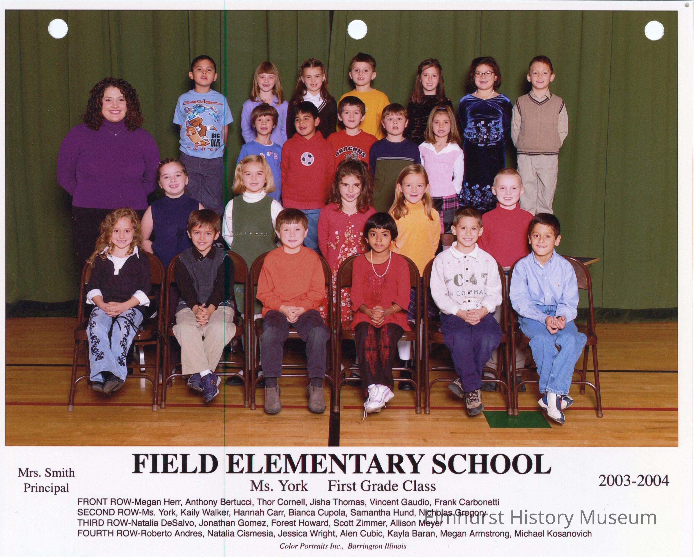 First grade class photograph from Field Elementary School, under teacher Ms. York. Student names are listed at the bottom of the photograph.Photograph Details