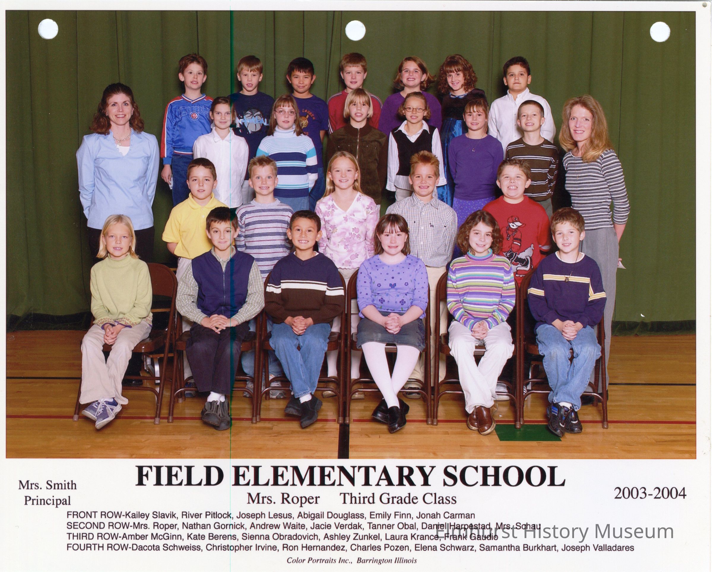Third grade class photograph from Field Elementary School, under teacher Mrs. Roper. Student names are listed at the bottom of the photograph.Photograph Details