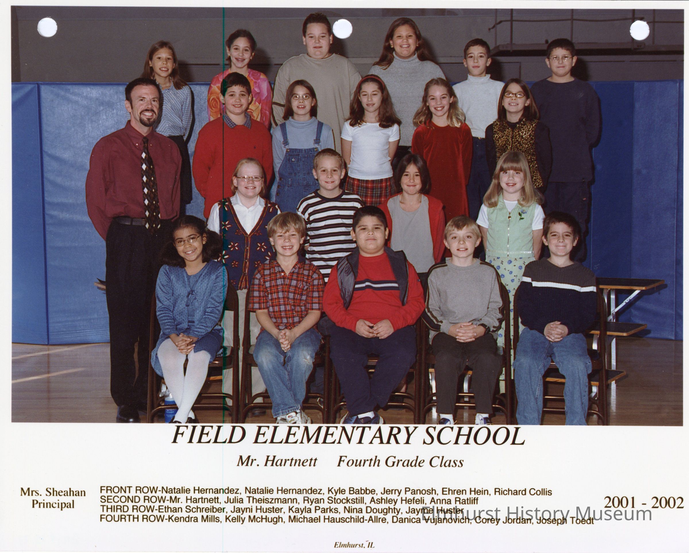 Fourth grade class photograph from Field Elementary School, under teacher Mr. Hartnett. Student names are listed at the bottom of the photograph.Photograph Details