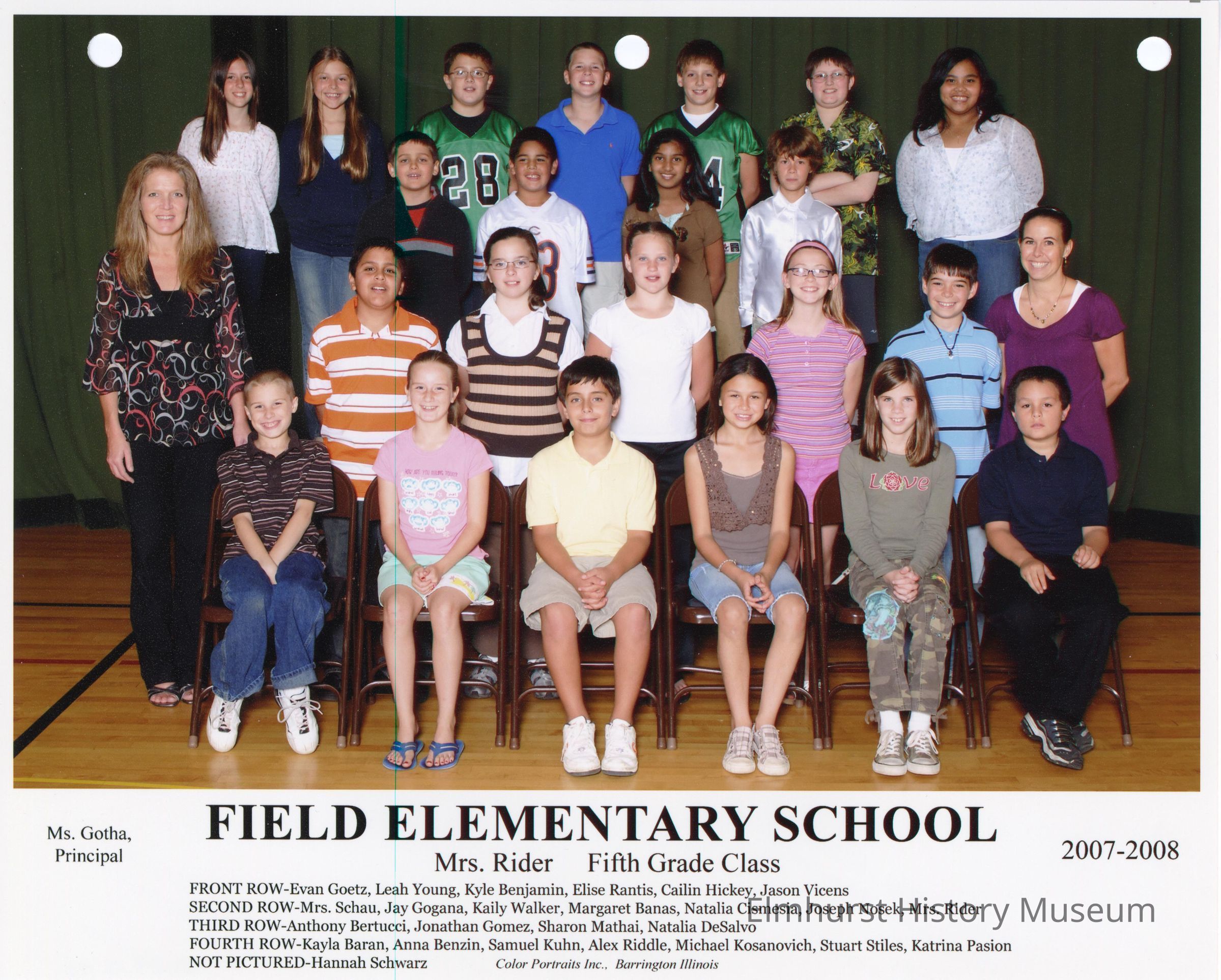 Fifth grade class photograph from Field Elementary School, under teacher, Mrs. Rider. Student names are listed at the bottom of the photograph.Photograph Details