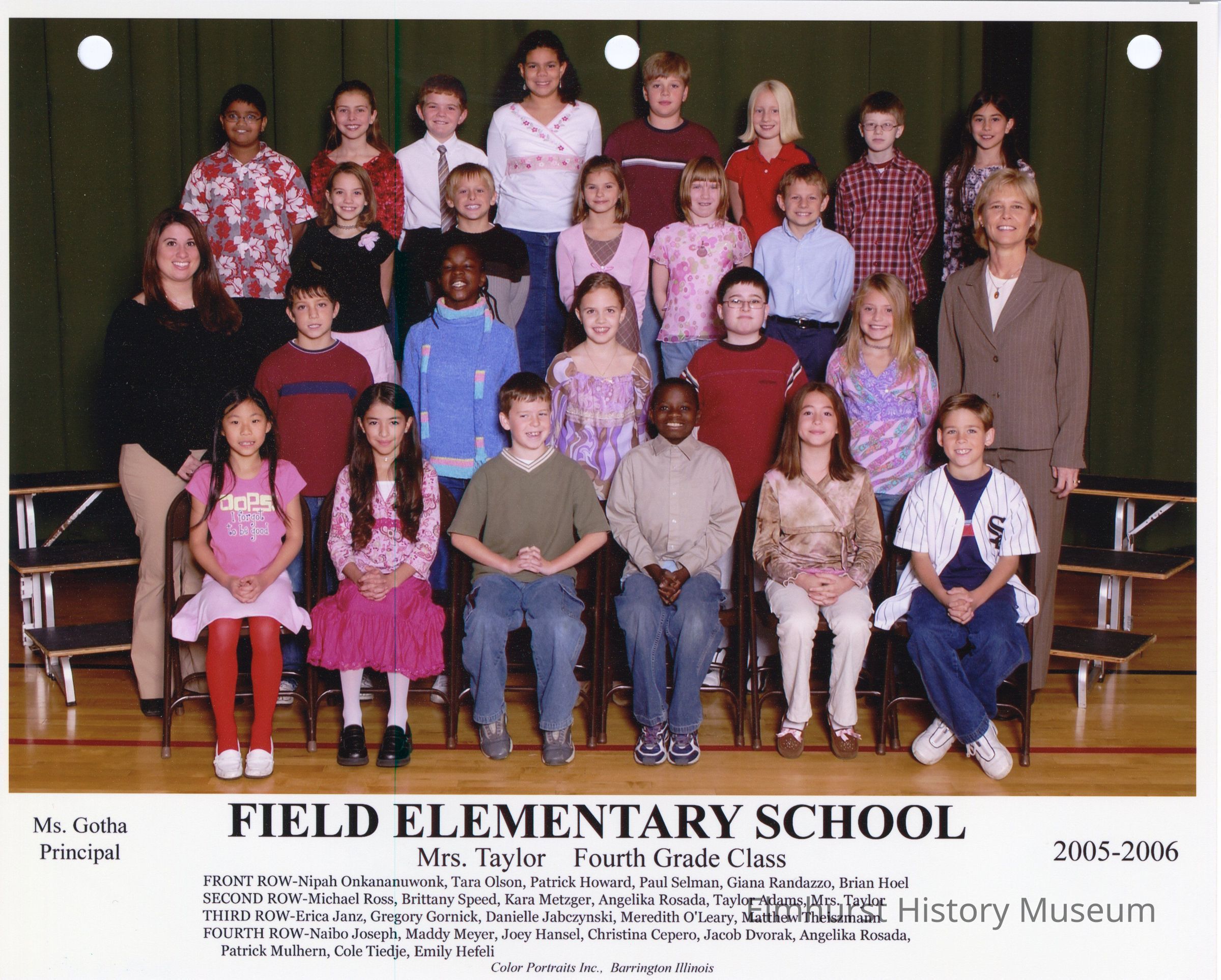 Fourth grade class photograph from Field Elementary School, under teacher Mrs. Taylor. Student names are listed at the bottom of the photograph.Photograph Details
