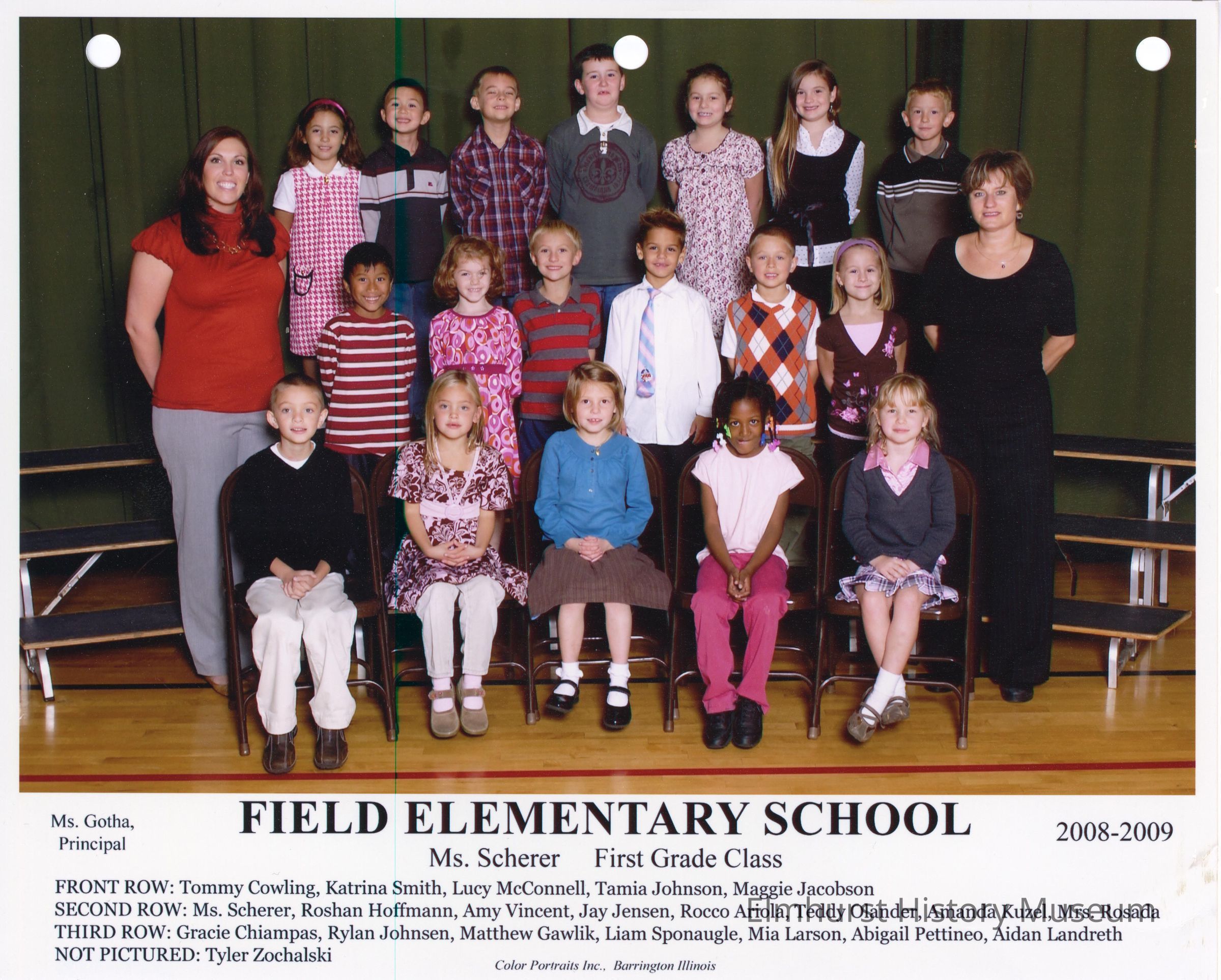 First Grade Class photograph from Field Elementary School, under teacher, Ms. Scherer Student names are listed at the bottom of the photograph.Photograph Details