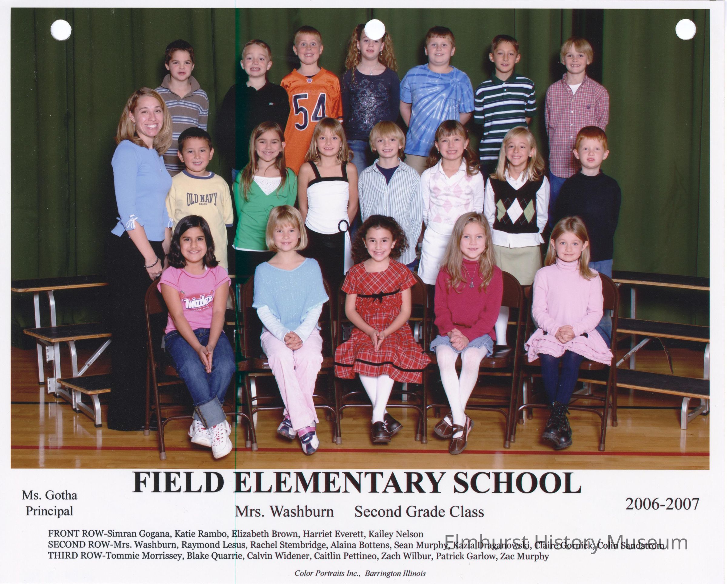 Second grade class photograph from Field Elementary School, under teacher Mrs. Washburn. Student names are listed at the bottom of the photograph.Photograph Details