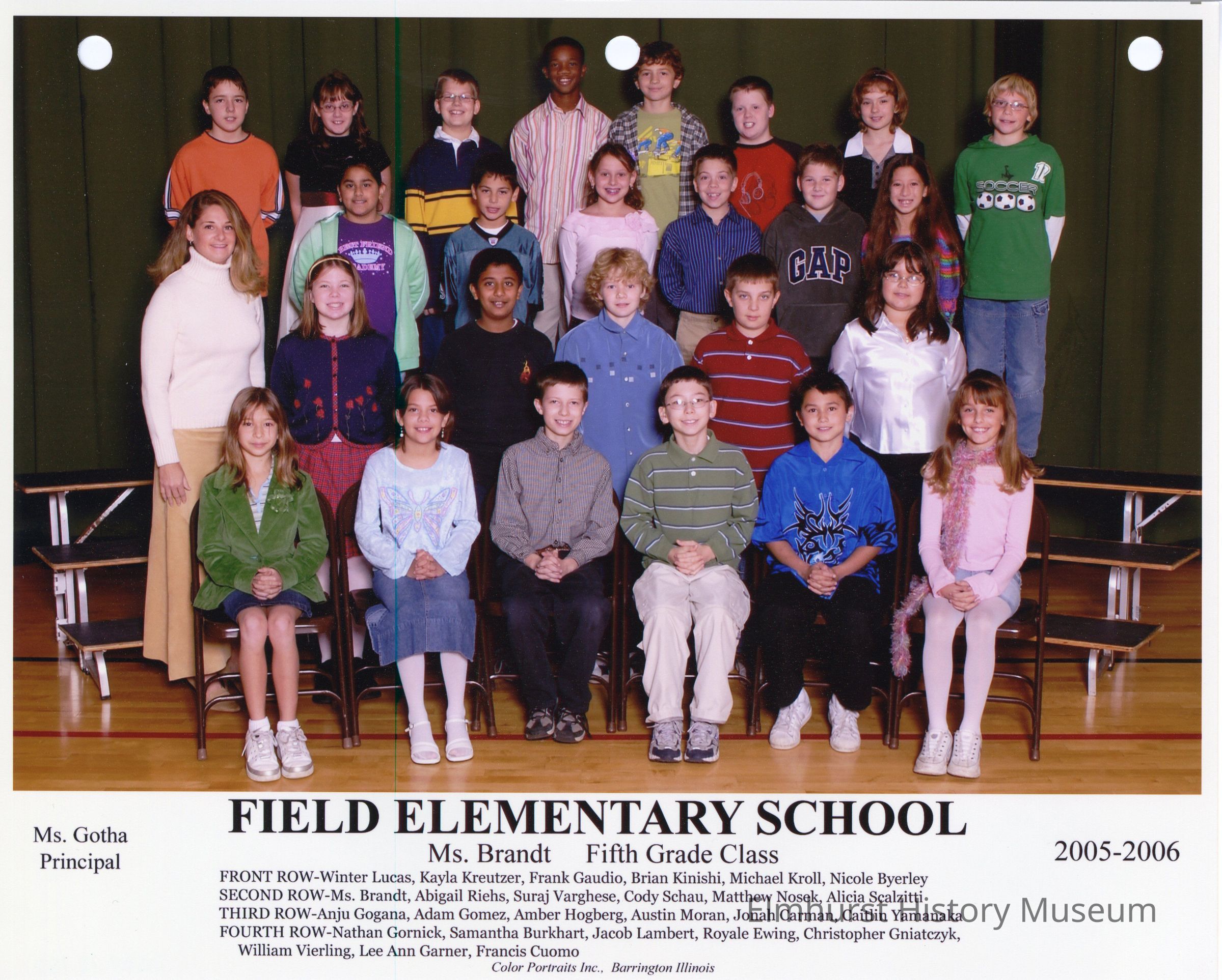 Fifth grade class photograph from Field Elementary School, under teacher Ms. Brandt. Student names are listed at the bottom of the photograph.Photograph Details