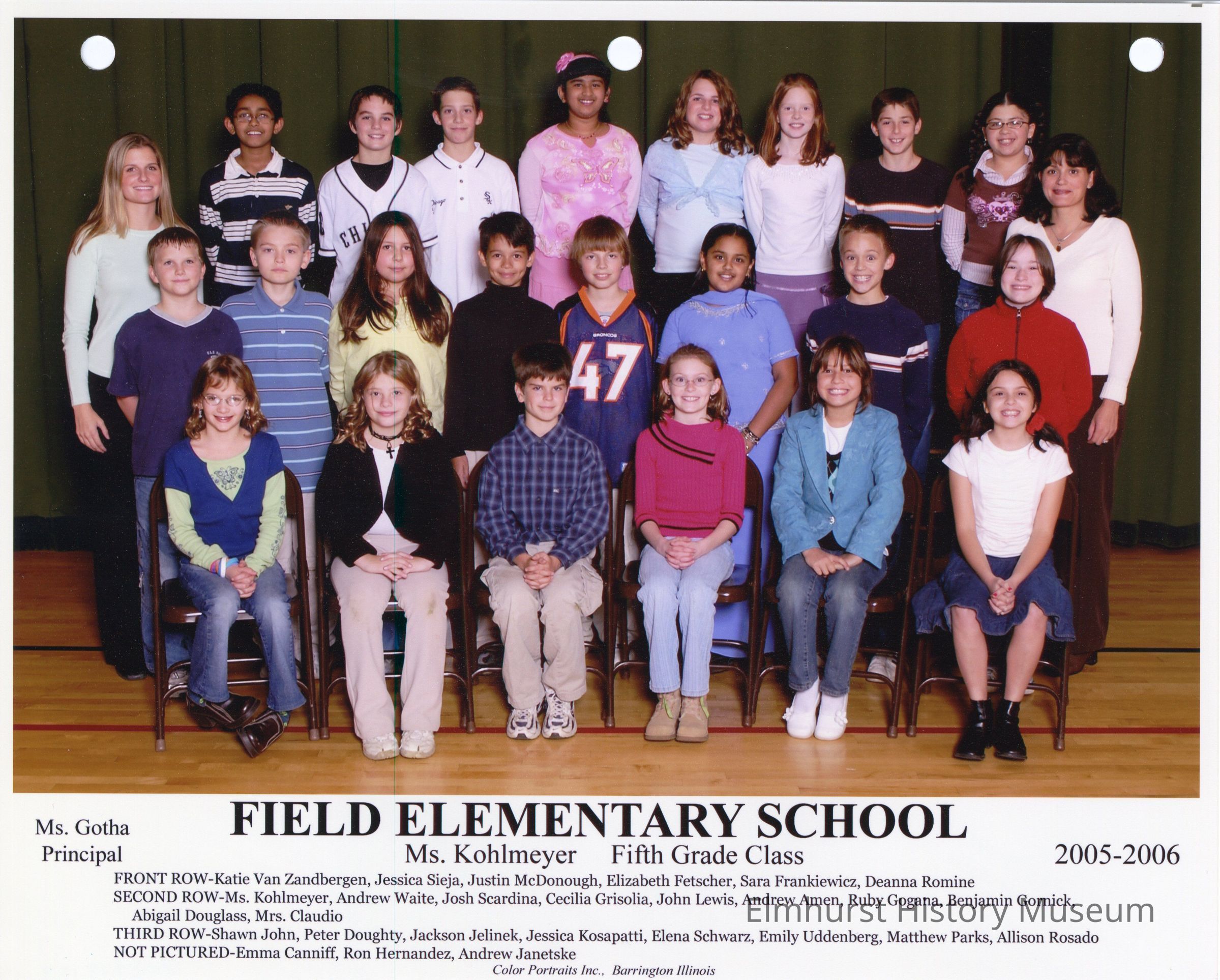 Fifth grade class photograph from Field Elementary School, under teacher Ms. Kohlmeyer. Student names are listed at the bottom of the photograph.Photograph Details