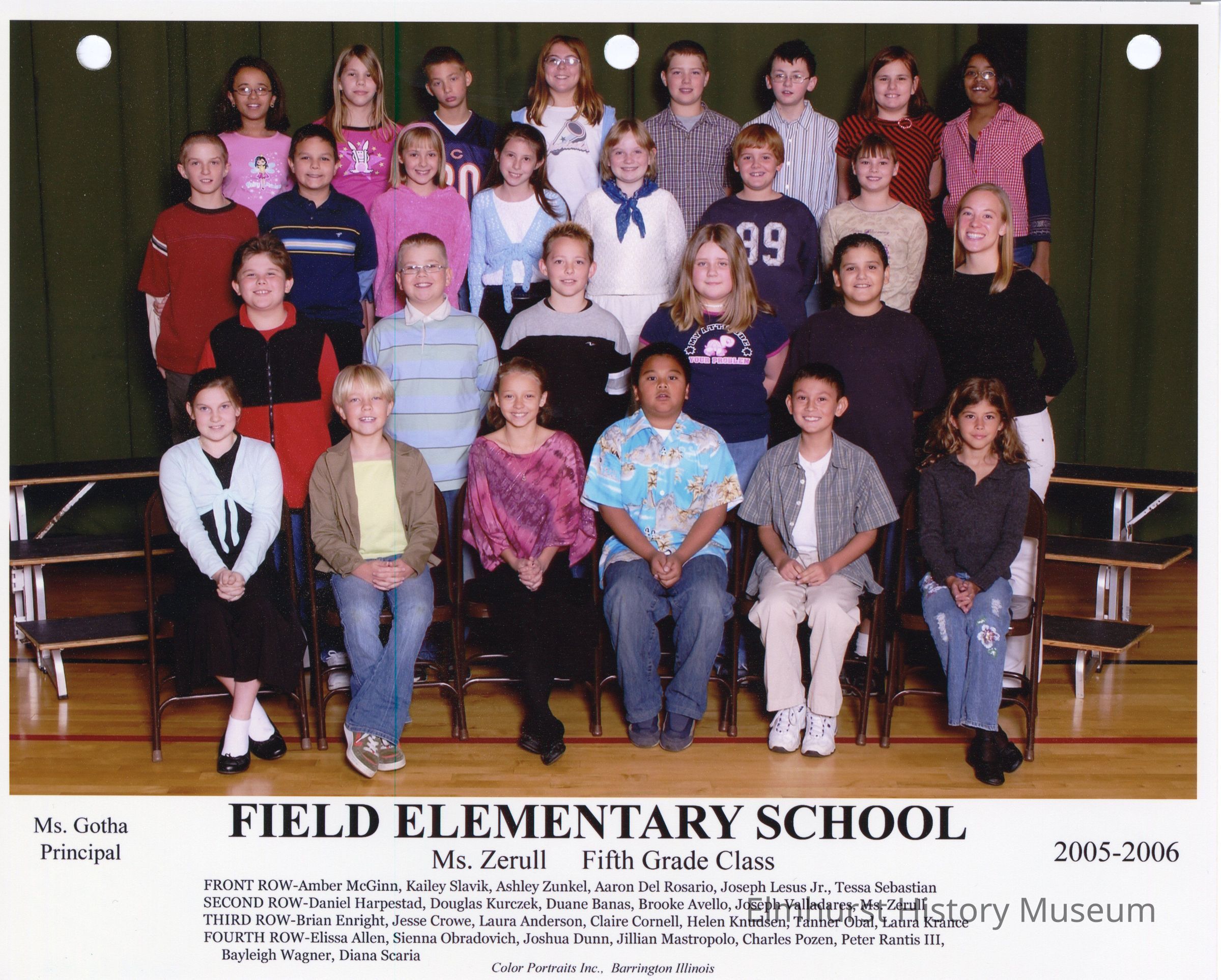 Fifth grade class photograph from Field Elementary School, under teacher Ms. Zerull. Student names are listed at the bottom of the photograph.Photograph Details