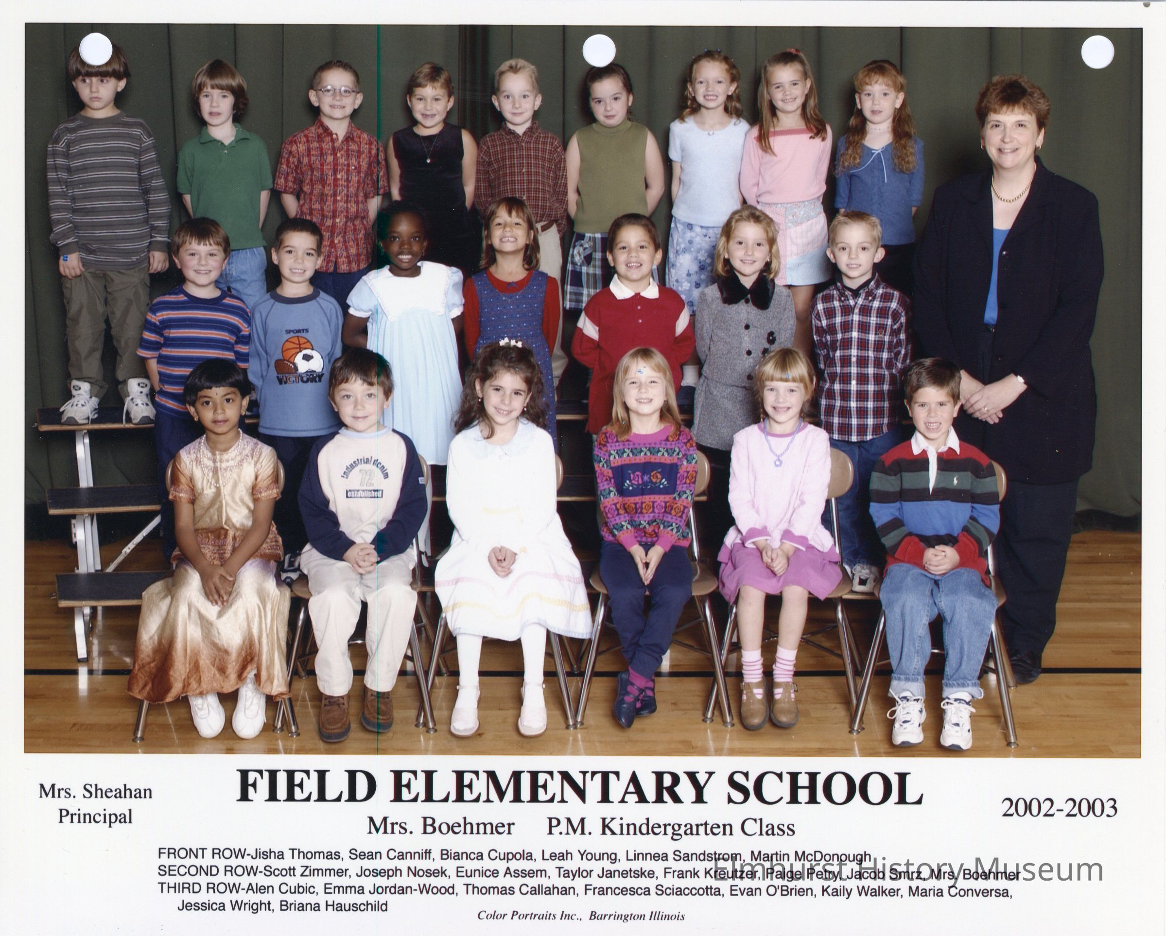 Kindergarten class photograph from Field Elementary School, under teacher Mrs. Boehmer. Student names are listed at the bottom of the photograph.Photograph Details