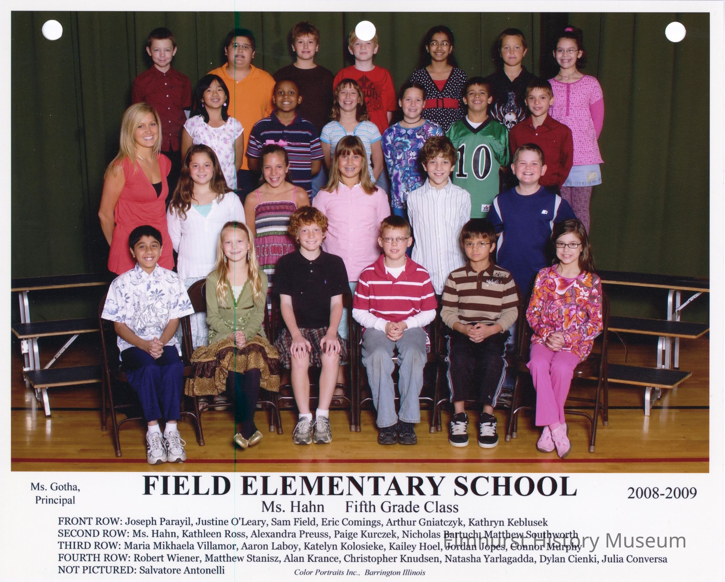 Fifth Grade Class photograph from Field Elementary School, under teacher, Ms. Hahn. Student names are listed at the bottom of the photograph.Photograph Details