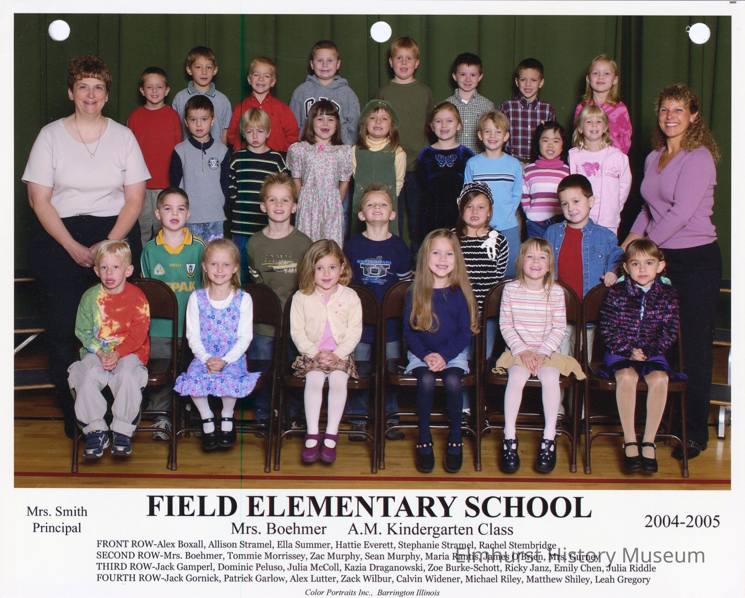 Kindergarten class photograph from Field Elementary School, under teacher Mrs. Boehmer. Student names are listed at the bottom of the photograph.Photograph Details