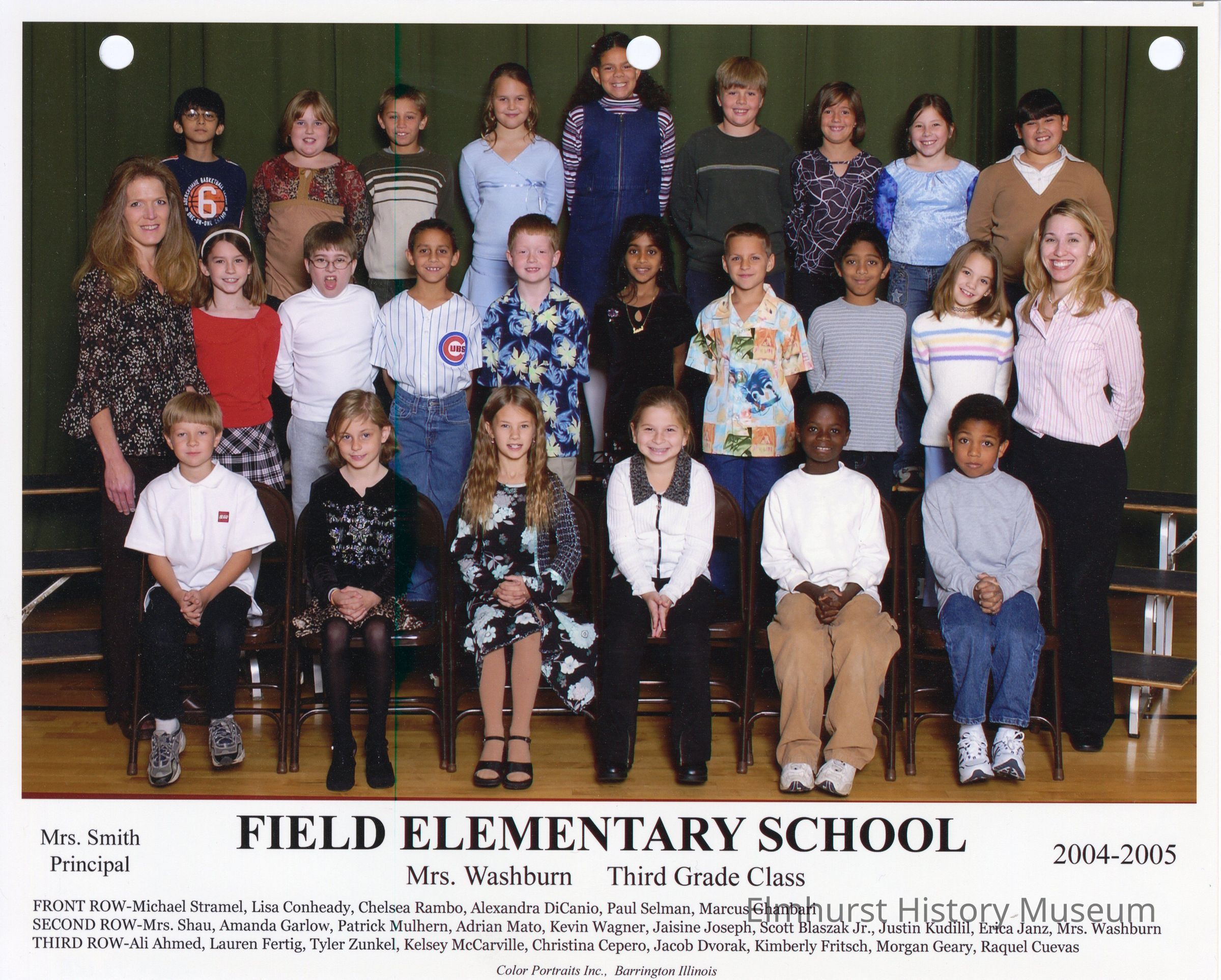 Third grade class photograph from Field Elementary School, under teacher Mrs. Washburn. Student names are listed at the bottom of the photograph.Photograph Details