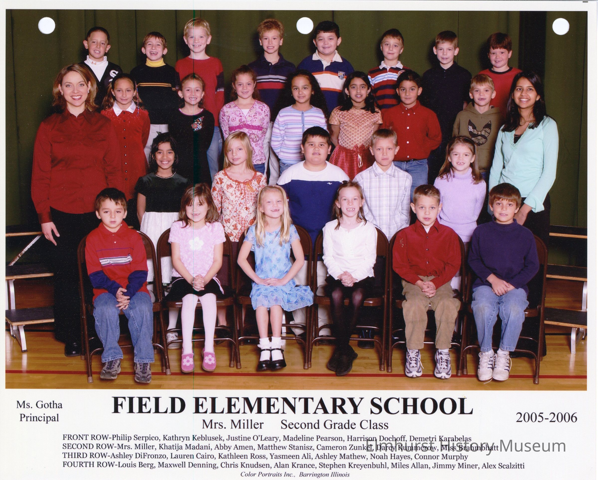 Second grade class photograph from Field Elementary School, under teacher Mrs. Miller. Student names are listed at the bottom of the photograph.Photograph Details