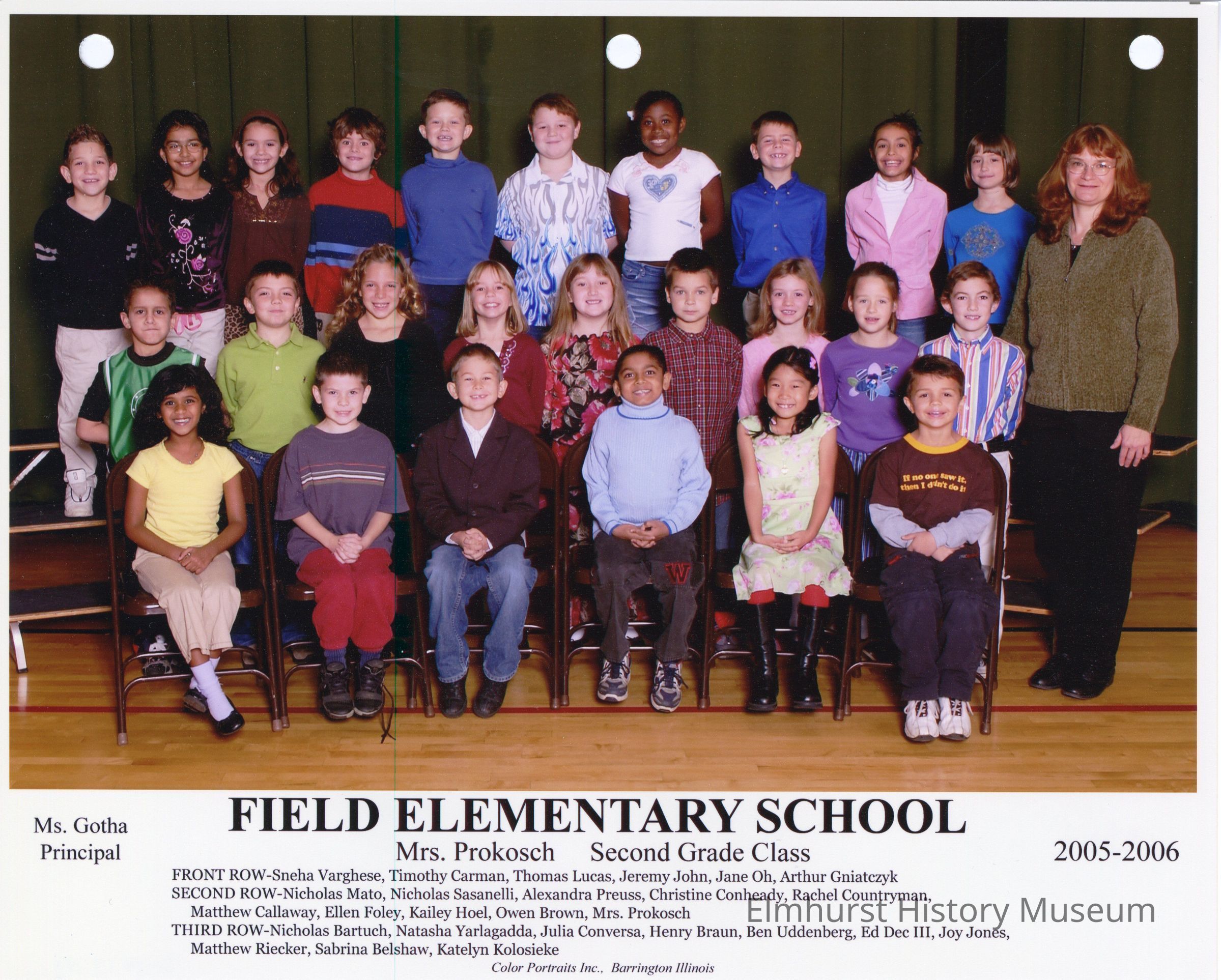Second grade class photograph from Field Elementary School, under teacher Mrs. Prokosch. Student names are listed at the bottom of the photograph.Photograph Details