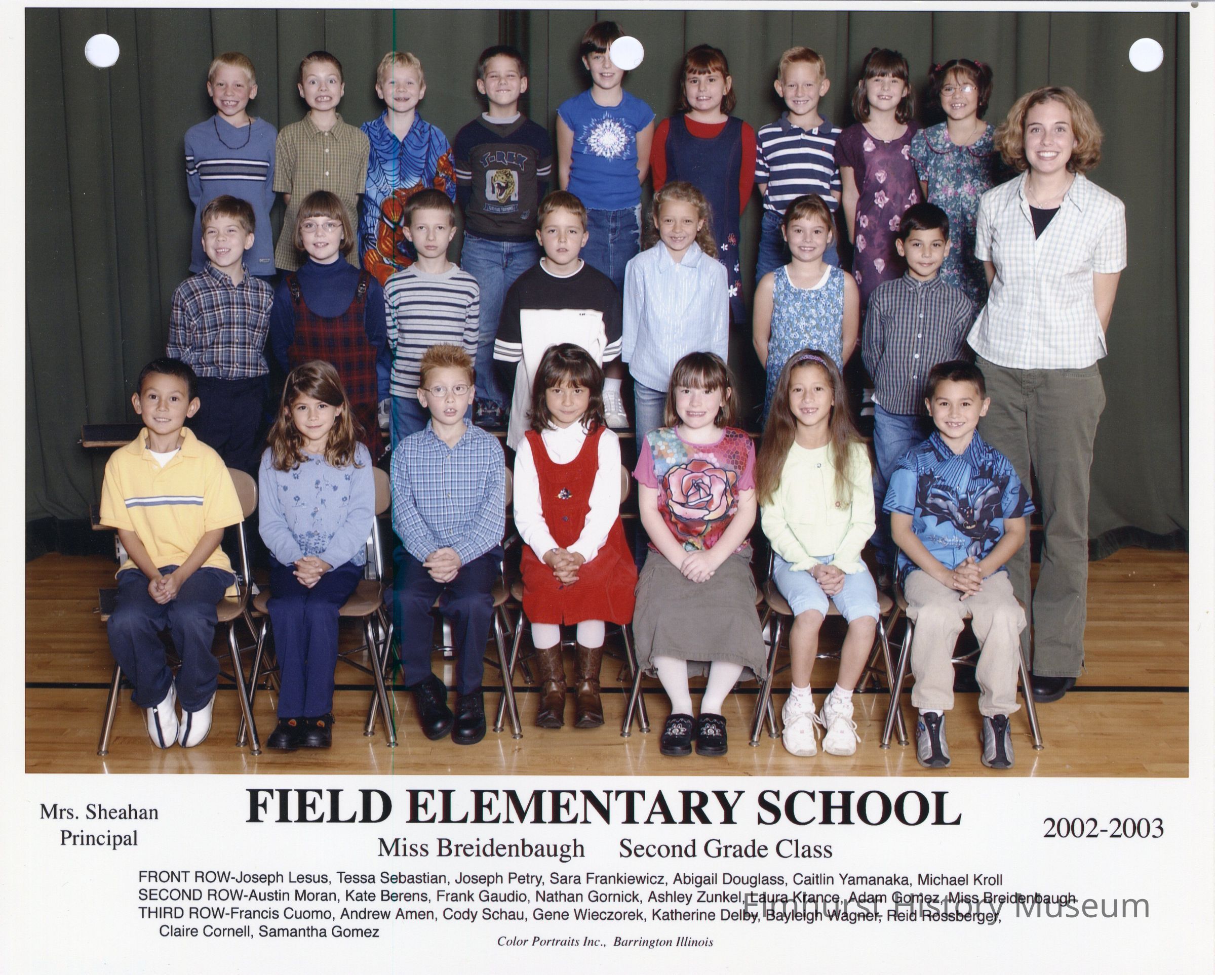 Second grade class photograph from Field Elementary School, under teacher Ms. Breidenbaugh. Student names are listed at the bottom of the photograph.Photograph Details
