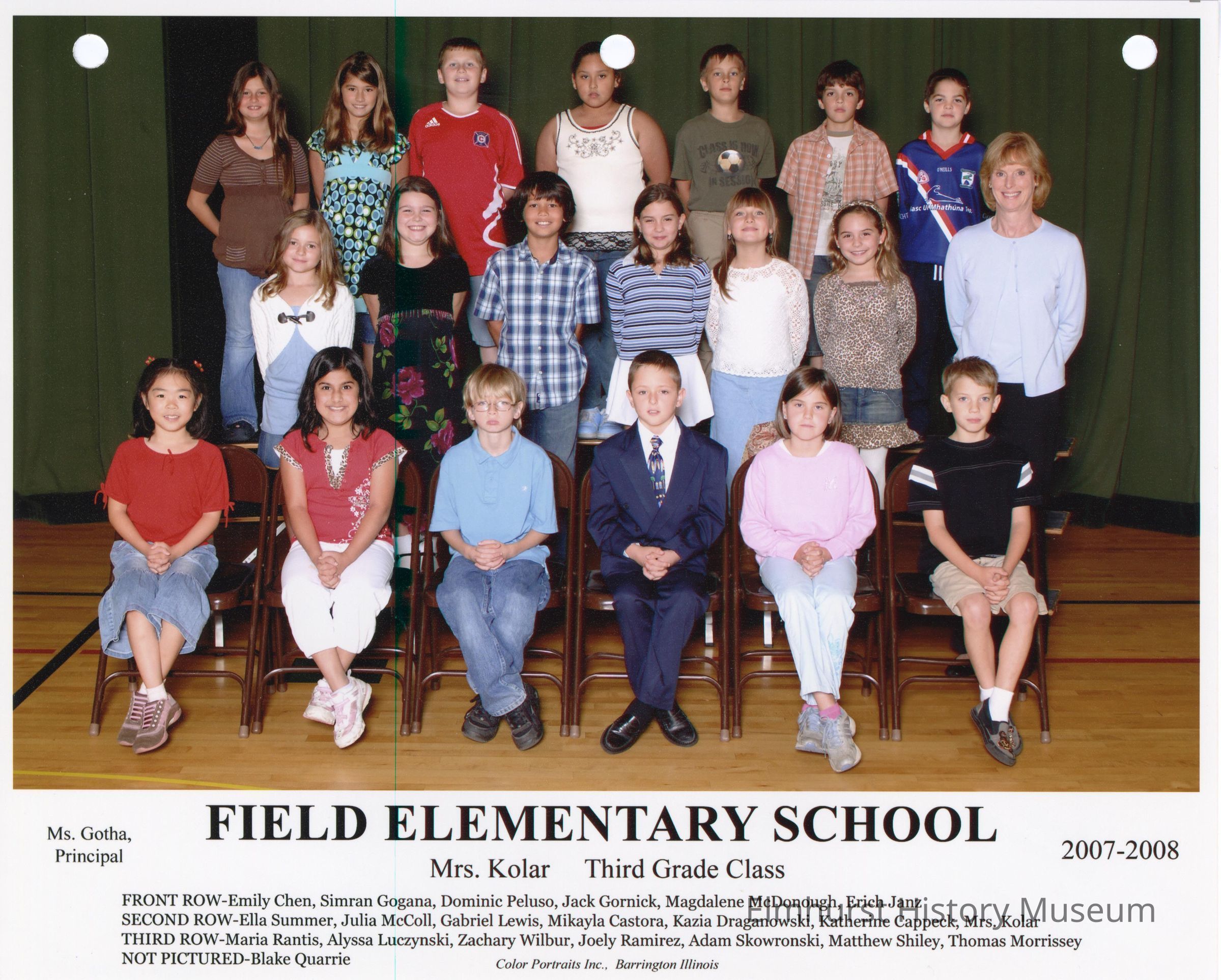 Third grade class photograph from Field Elementary School, under teacher, Mrs. Kolar. Student names are listed at the bottom of the photograph.Photograph Details