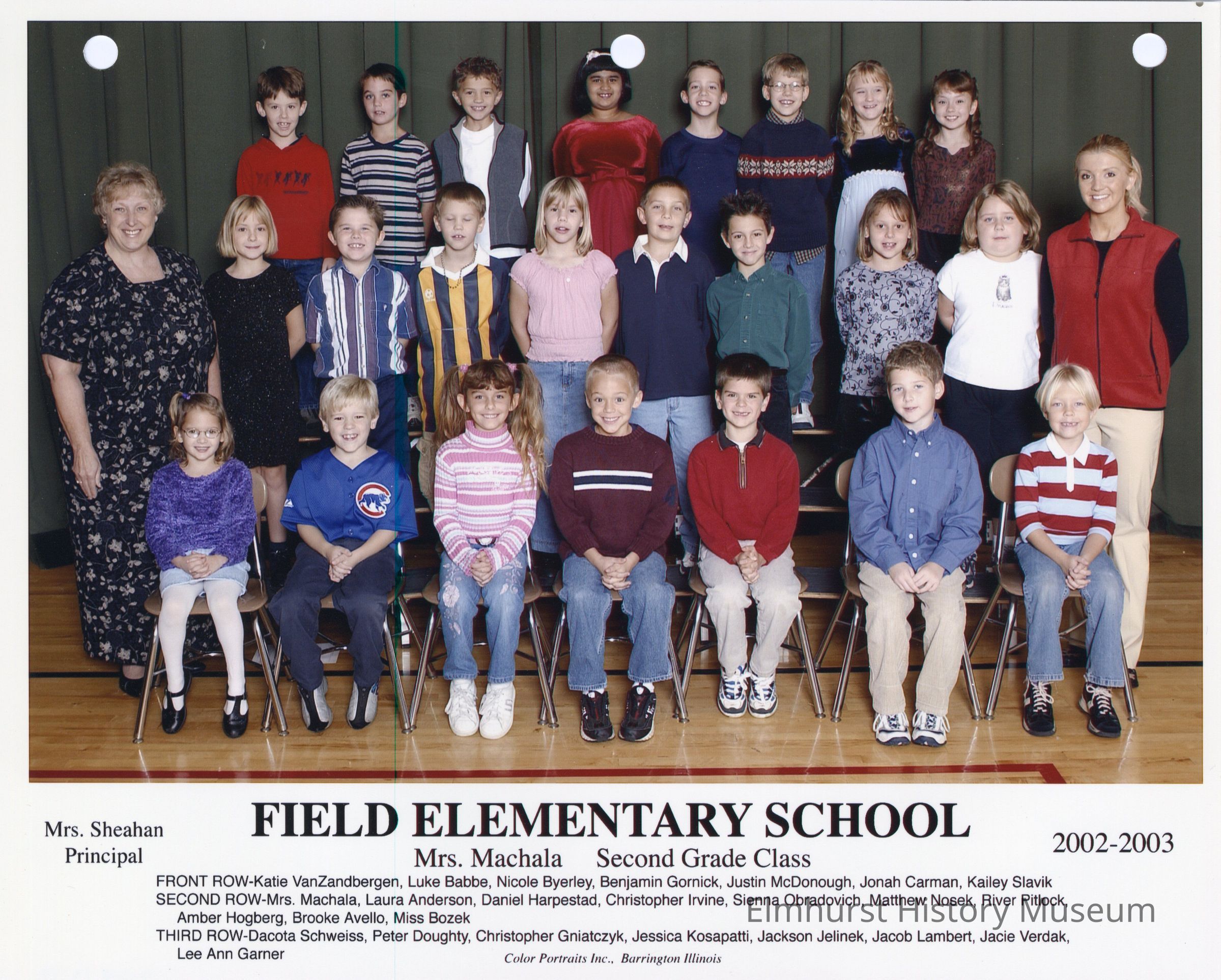 Second grade class photograph from Field Elementary School, under teacher Mrs. Machala. Student names are listed at the bottom of the photograph.Photograph Details