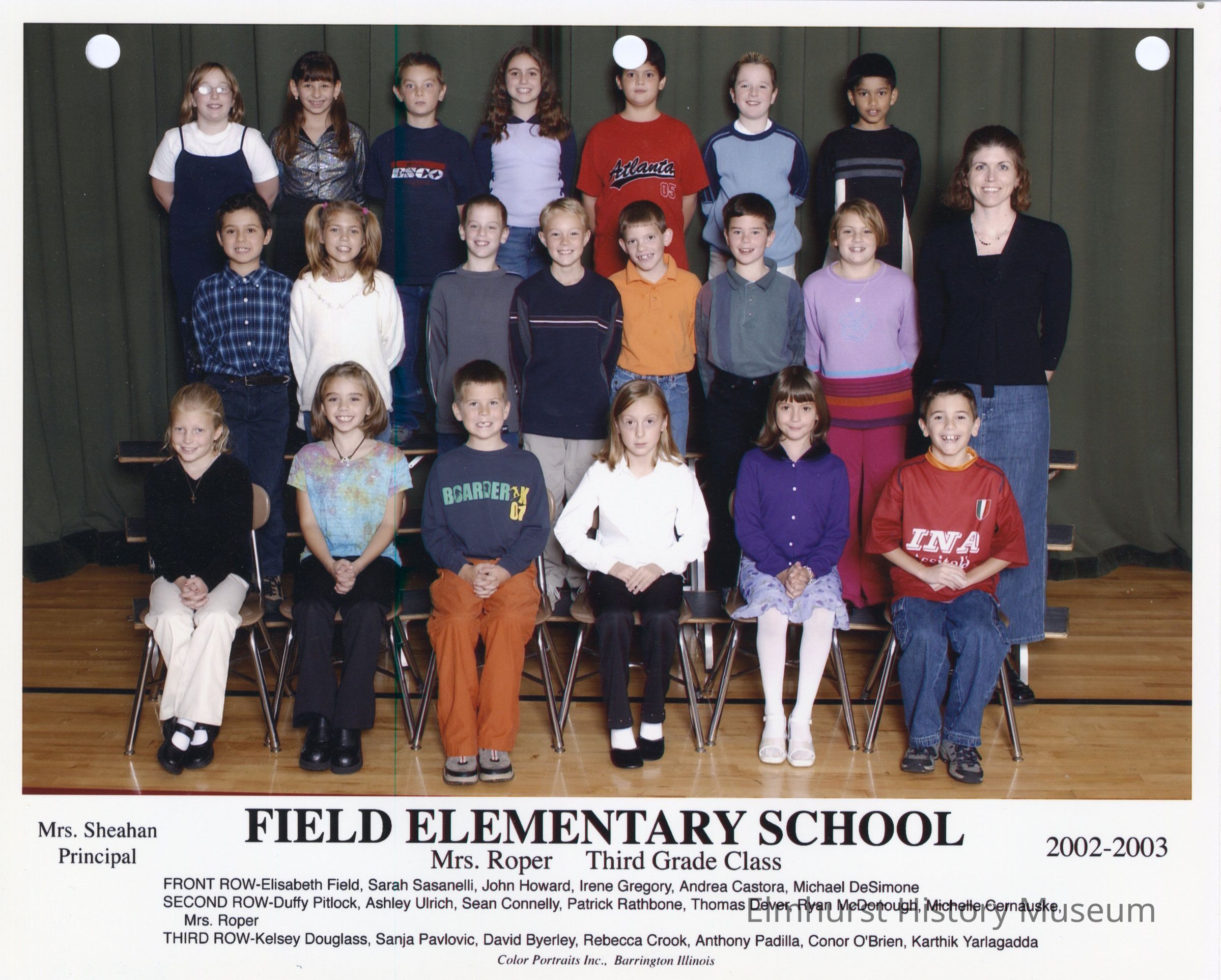 Third grade class photograph from Field Elementary School, under teacher Mrs. Roper. Student names are listed at the bottom of the photograph.Photograph Details