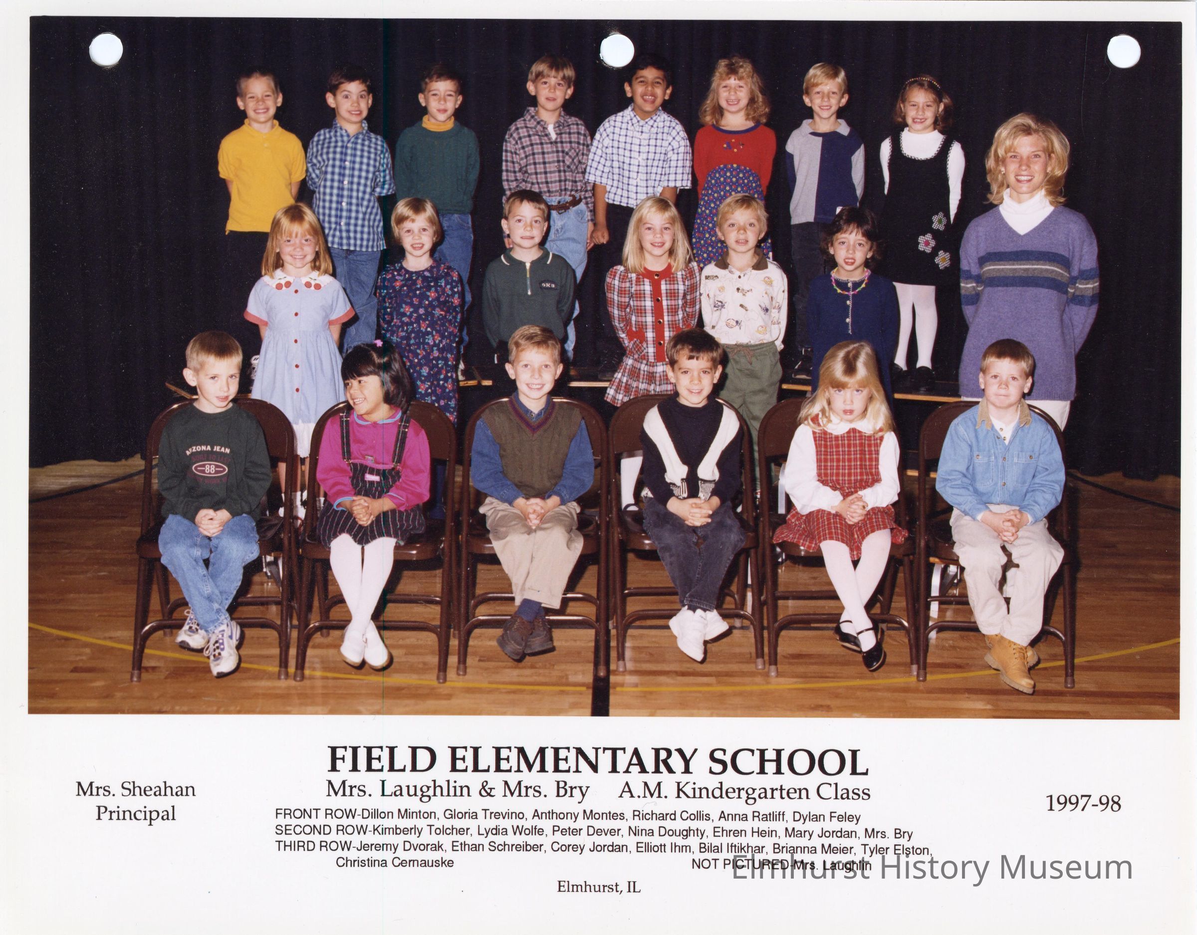 Kindergarten class photograph from Field Elementary School, under teachers Mrs. Laughlin and Mrs. Bry. Student names are listed at the bottom of the photograph.Photograph Details
