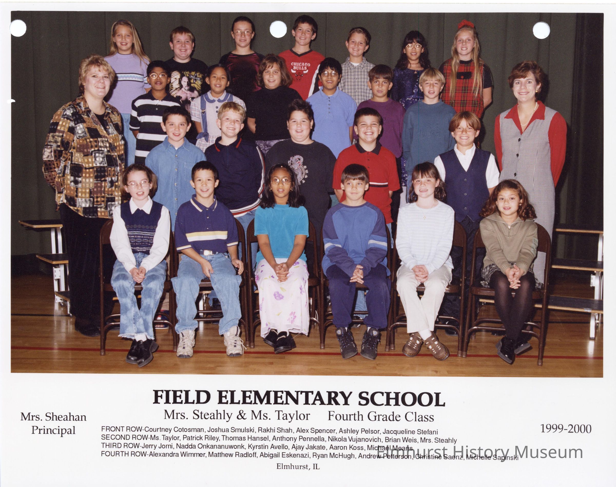 Fourth grade class photograph from Field Elementary School, under teachers Mrs. Steahly and Ms. Taylor. Student names are listed at the bottom of the photograph.Photograph Details