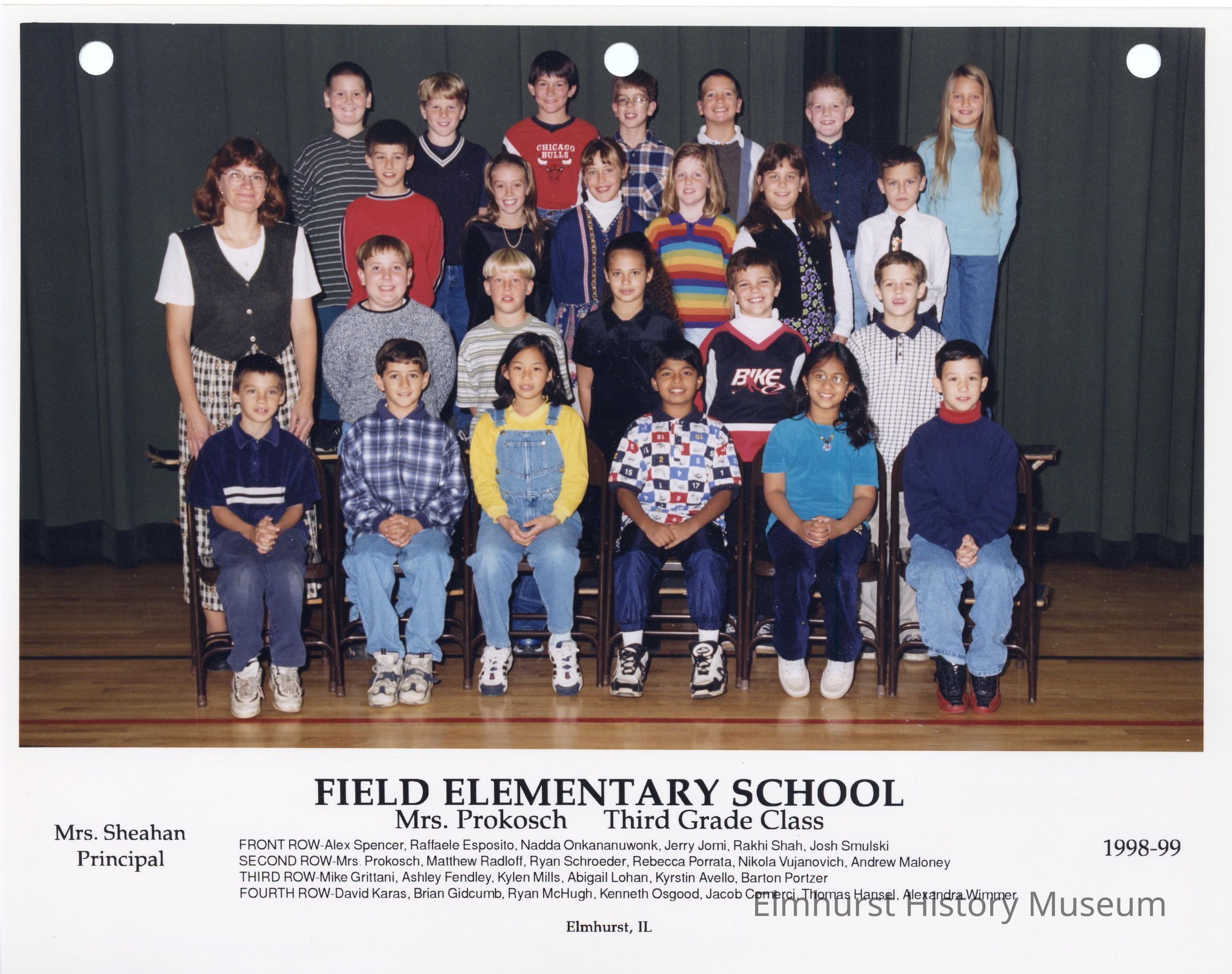 Third grade class photograph from Field Elementary School, under teacher Mrs. Prokosch. Student names are listed at the bottom of the photograph.Photograph Details