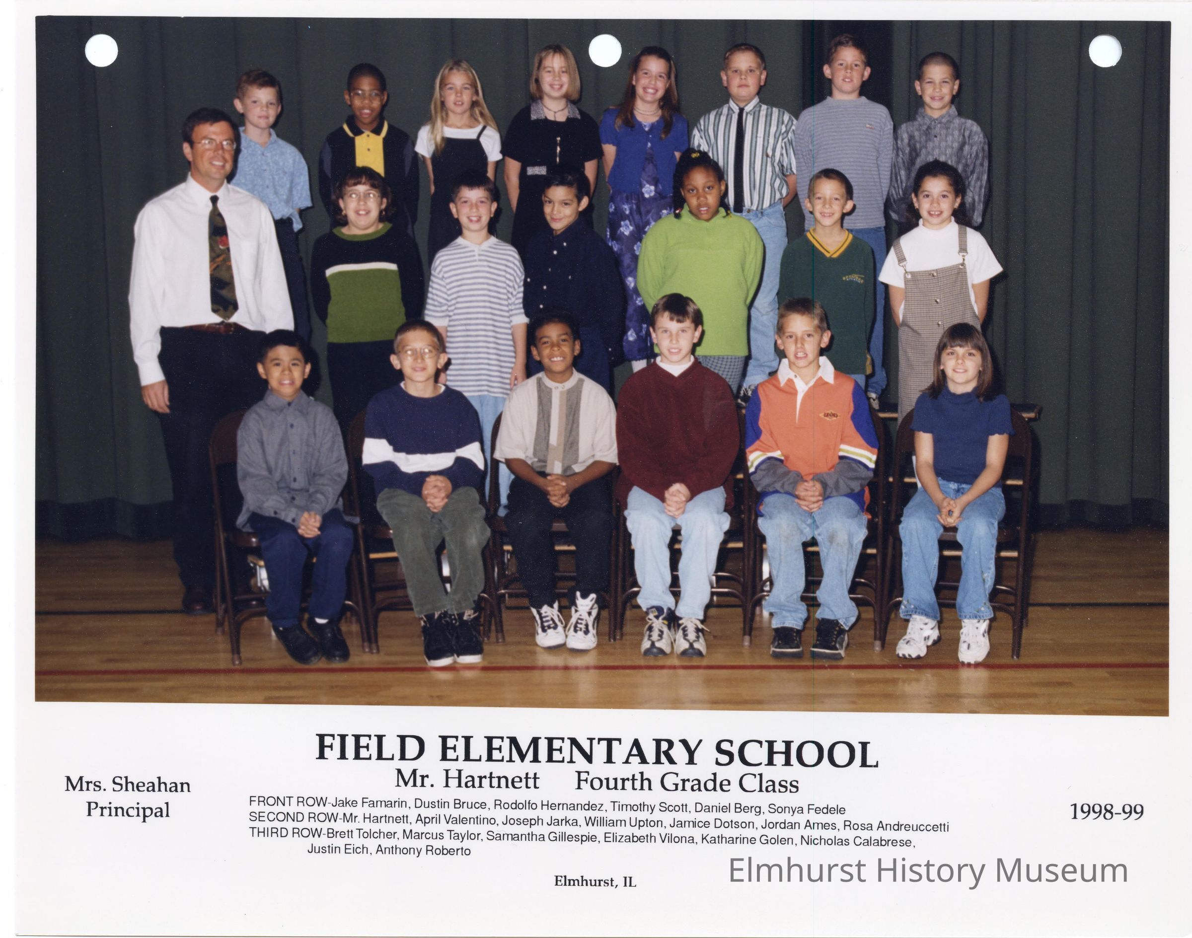 Fourth grade class photograph from Field Elementary School, under teacher Mr. Hartnett. Student names are listed at the bottom of the photograph.Photograph Details