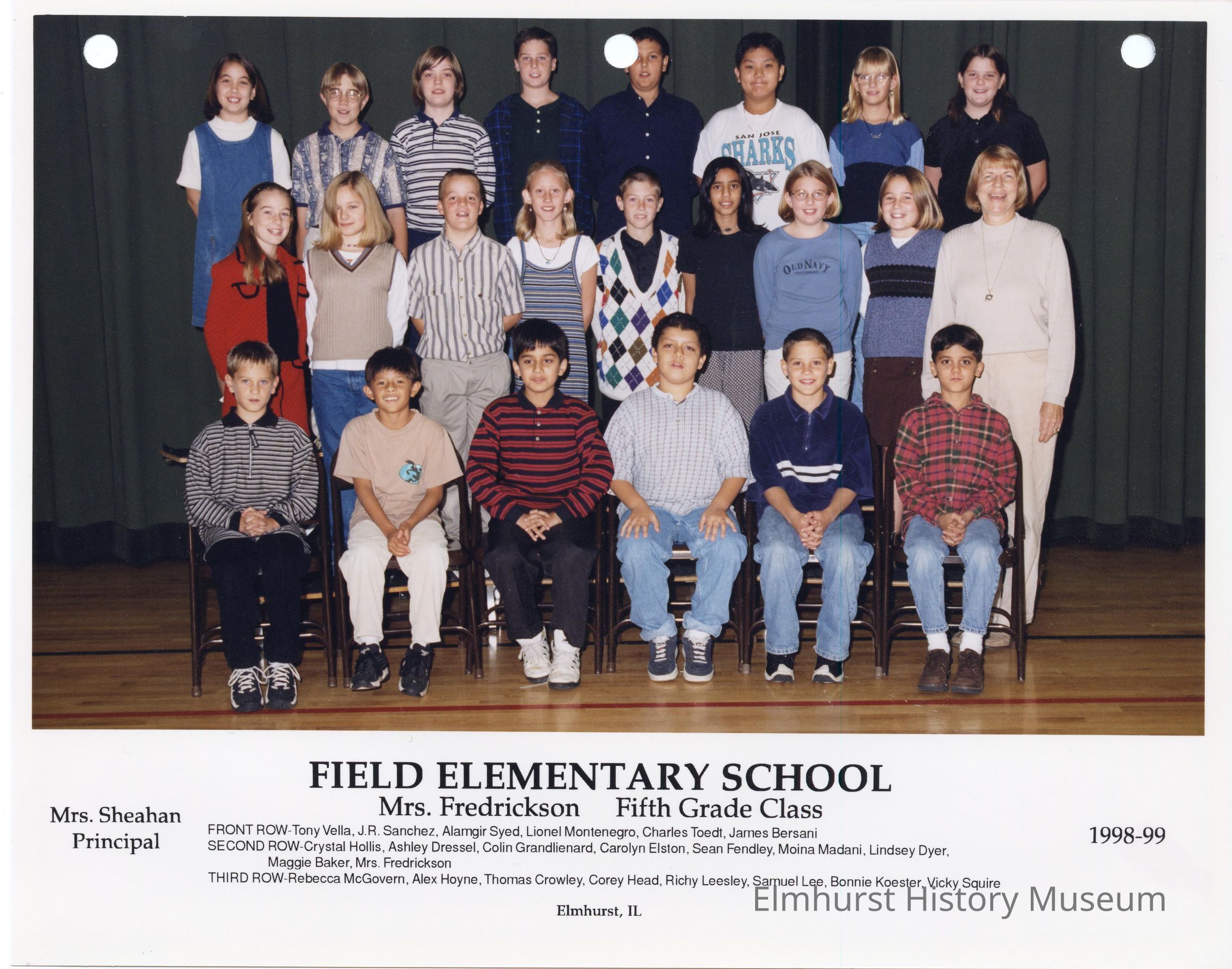 Fifth grade class photograph from Field Elementary School, under teacher Mrs. Fredricksen. Student names are listed at the bottom of the photograph.Photograph Details