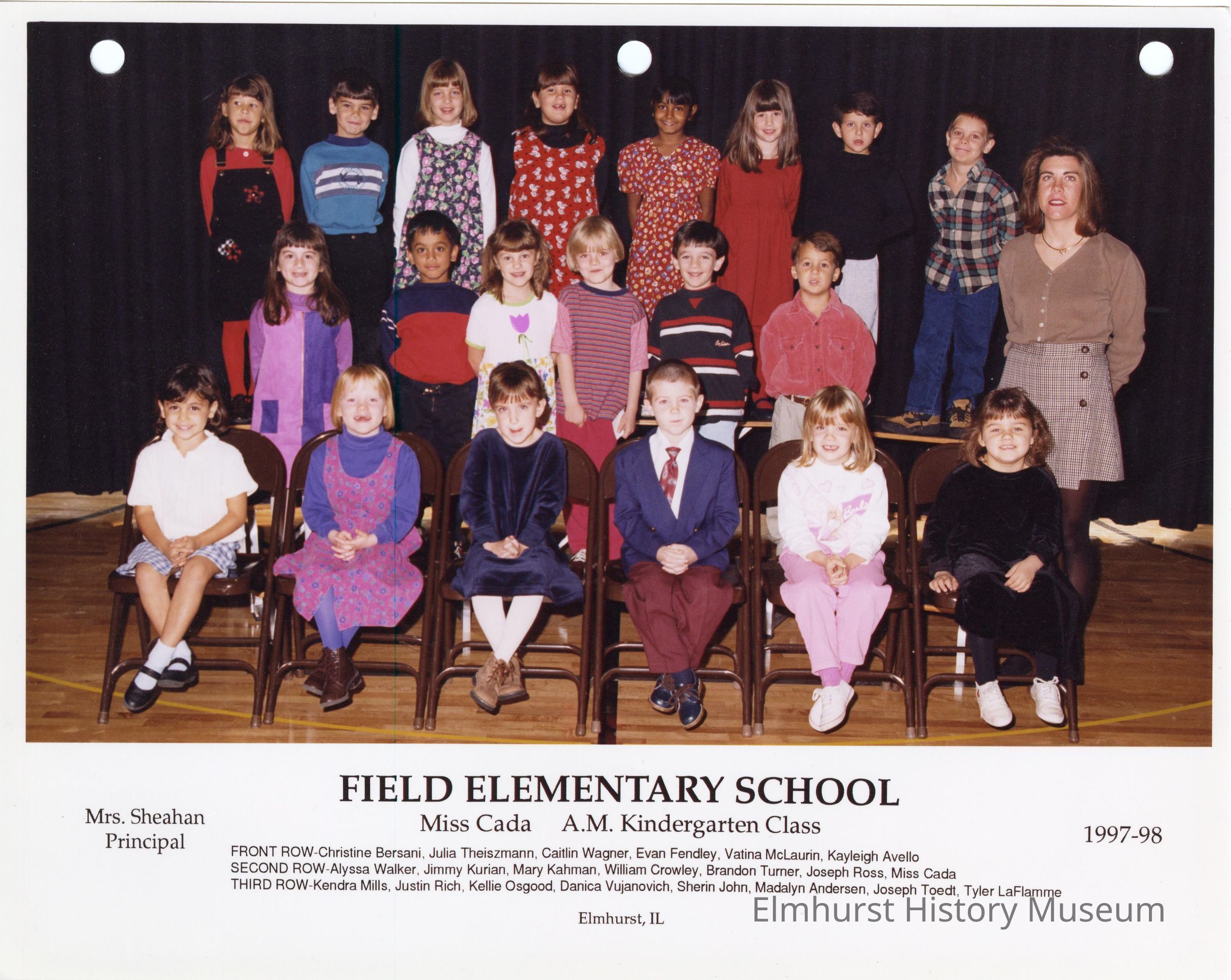 Kindergarten class photograph from Field Elementary School, under teacher Ms. Cada. Student names are listed at the bottom of the photograph.Photograph Details