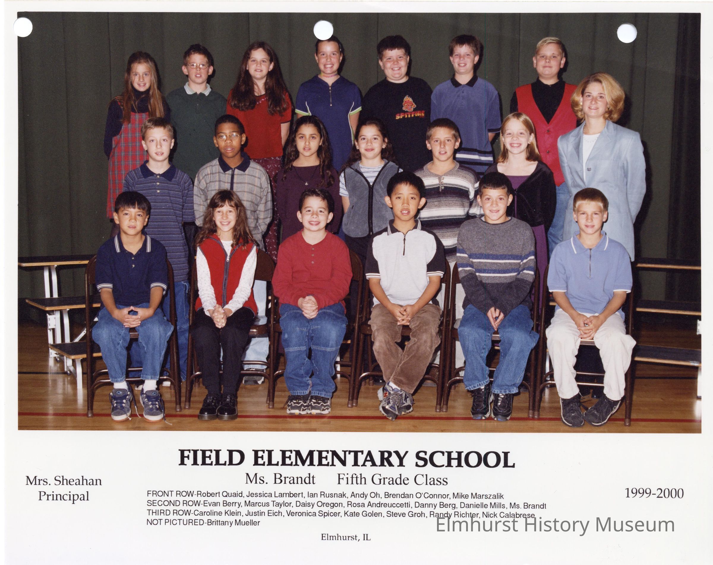 Fifth grade class photograph from Field Elementary School, under teacher Ms. Brandt. Student names are listed at the bottom of the photograph.Photograph Details
