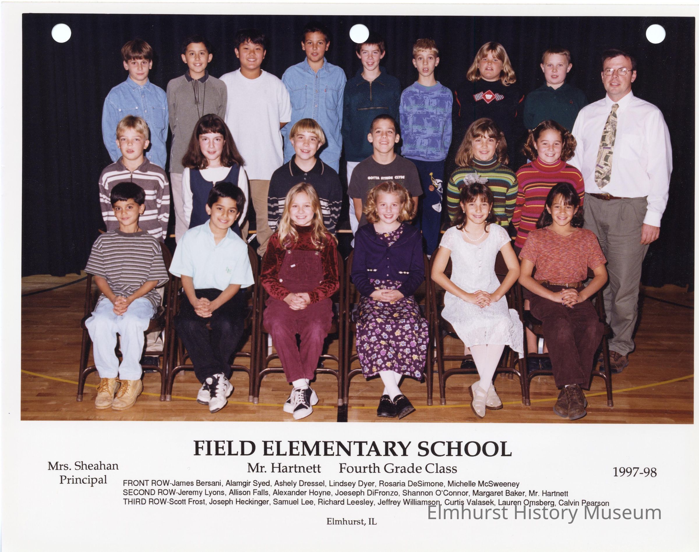Fourth grade class photograph from Field Elementary School, under teacher Mr. Hartnett. Student names are listed at the bottom of the photograph.Photograph Details
