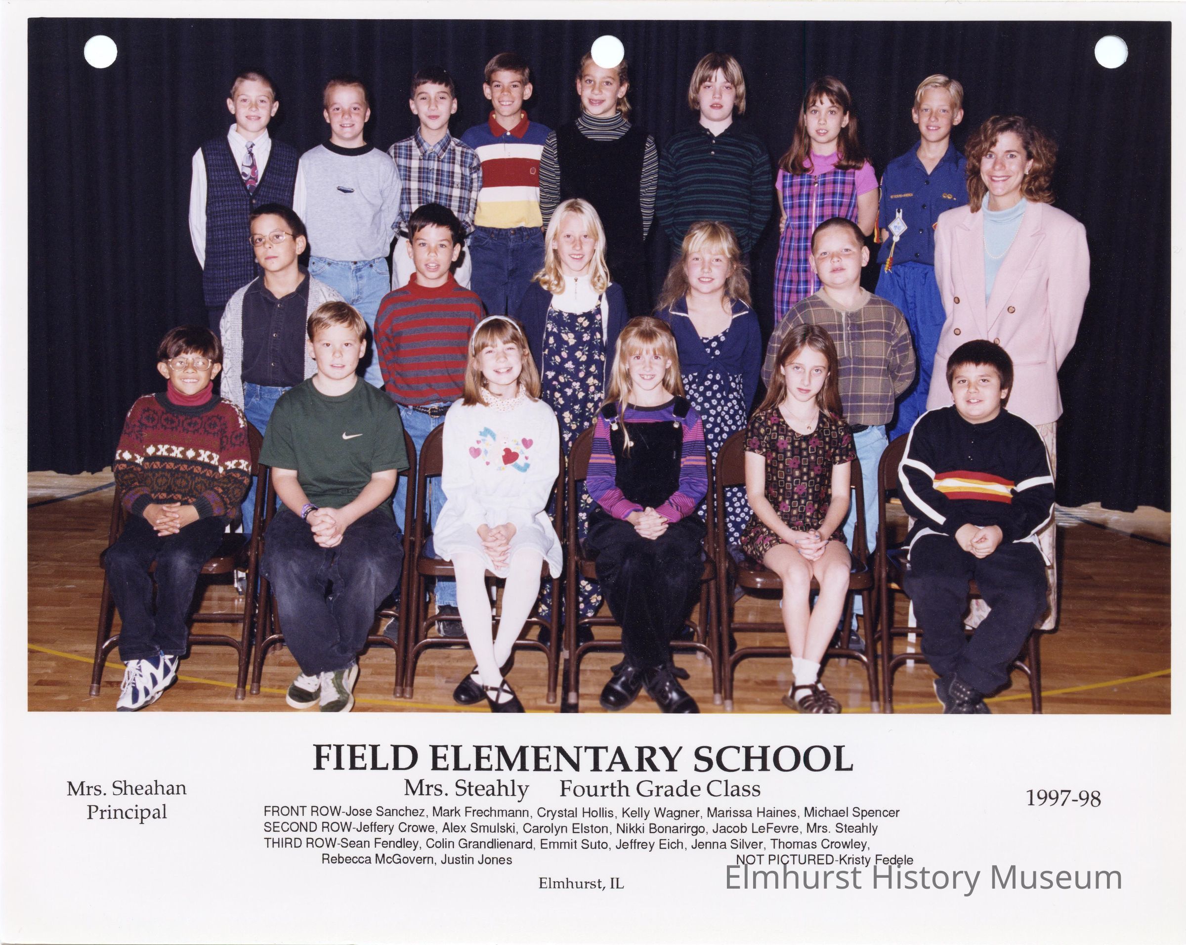 Fourth grade class photograph from Field Elementary School, under teacher Mrs. Steahly. Student names are listed at the bottom of the photograph.Photograph Details